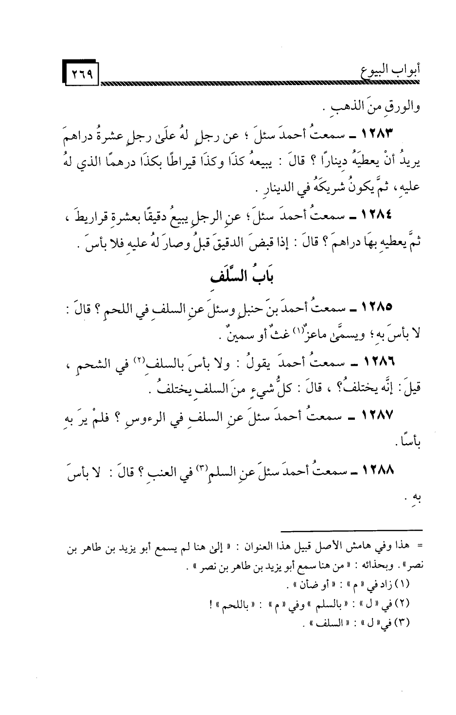 1285 - سَمِعْتُ أَحْمَدَ بْنَ حَنْبَلٍ، " سُئِلَ عَنِ السَّلَفِ فِي اللَّحْمِ؟ قَالَ: لَا بَأْسَ بِهِ، وَيُسَمَّى مَاعِزٌ غَثٌّ أَوْ سَمِينٌ «.