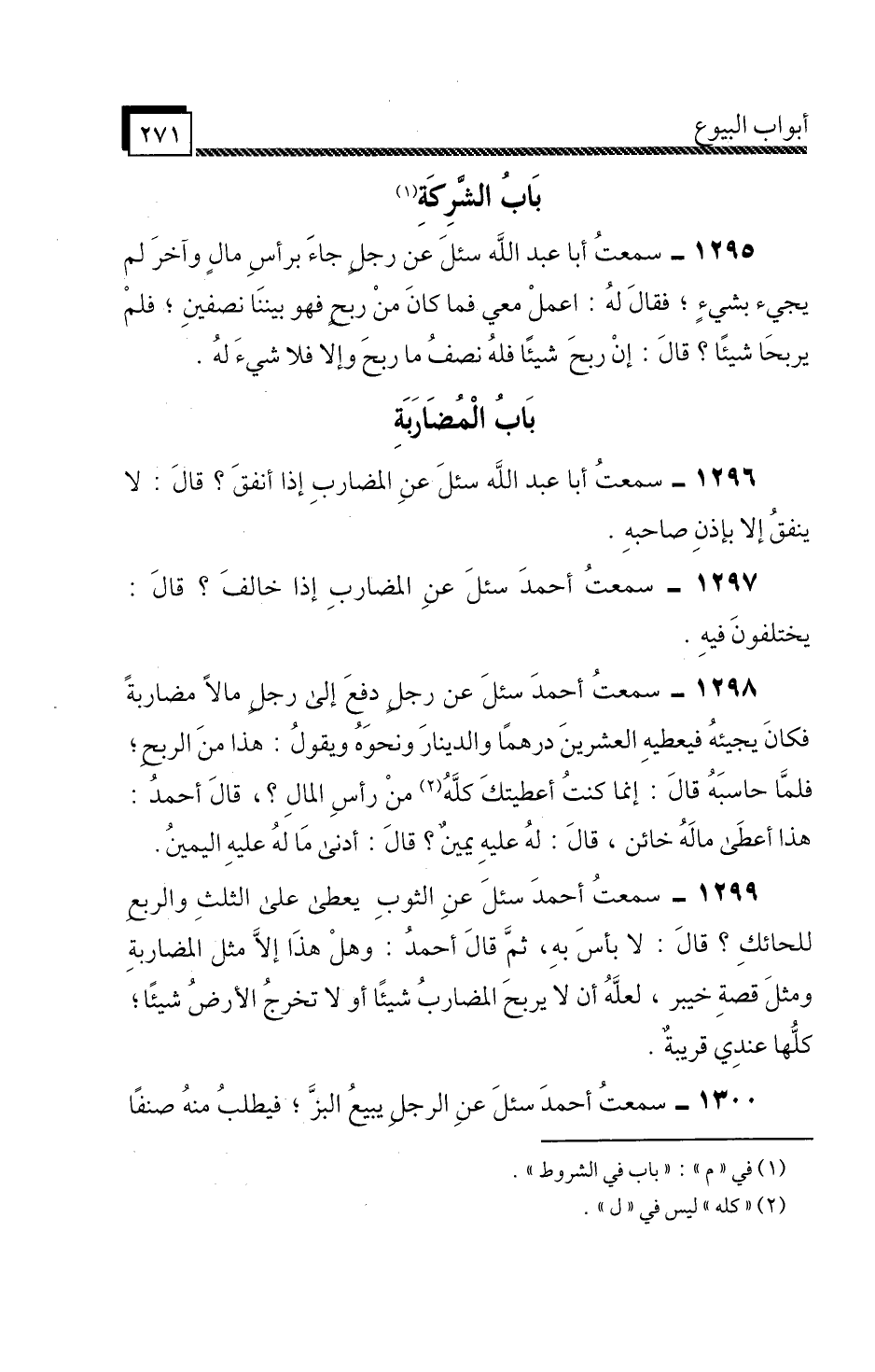 1295 - سمعتُ أَبَا عَبْدِ اللَّهِ، " سُئِلَ عَنْ رَجُلٍ بِرَأْسِ مَالٍ، وَآخَرَ لَمْ يَجِيءْ، فَقَالَ لَهُ: اعْمَلْ مَعِي فَمَا كَانَ مِنْ رِبْحٍ فَهُوَ بَيْنَنَا نِصْفَيْنِ، فَلَمْ يَرْبَحَا شَيْئًا؟ قَالَ: إِنْ رَبِحَ شَيْئًا فَلَهُ نِصْفُ مَا رَبِحَ، وَإِلَّا فَلَا شَيْءَ لَهُ ".