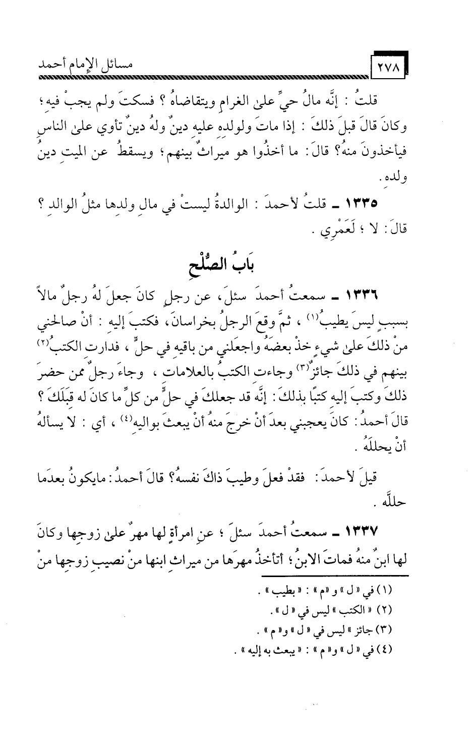 1336 - سَمِعْتُ أَحْمَدَ، " سُئِلَ عَنْ رَجُلٍ كَانَ جَعَلَ لَهُ رَجُلٌ مَالًا بِسَبَبٍ لَيْسَ يَطِيبُ، ثُمَّ وَقَعَ الرَّجُلُ بِخُرَاسَانَ، فَكَتَبَ إِلَيْهِ: أَنْ صَالِحْنِي مِنْ ذَلِكَ عَلَى شَيْءٍ، خُذْ بَعْضَهُ وَاجْعَلْنِي مِنْ بَاقِيهِ فِي حِلٍّ، فَدَارَتِ الْكُتُبُ بَيْنَهُمْ فِي ذَلِكَ جَائِزٌ، وَجَاءَتِ الْكُتُبُ بِالْعَلَامَاتِ، وَجَاءَ رَجُلٌ مِمَّنْ حَضَرَ ذَلِكَ، وَكَتَبَ إِلَيْهِ كُتُبًا بِذَلِكَ: إِنَّهُ قَدْ جَعَلَكَ فِي حِلٍّ مِنْ كُلِّ مَا كَانَ لَهُ قَبْلَكَ؟ قَالَ أَحْمَدُ: كَانَ يُعْجِبُنِي بَعْدَ أَنْ خَرَجَ مِنْهُ أَنْ يَبْعَثَ بِوَالِيهِ، أَيْ: لَا يَسْأَلَهُ أَنْ يُحَلِّلَهُ، قِيلَ لِأَحْمَدَ: فَقَدْ فَعَلَ وَطَيَّبَ ذَاكَ نَفْسَهُ؟ قَالَ أَحْمَدُ: مَا يَكُونُ بَعْدَمَا حَلَّلَهُ «.