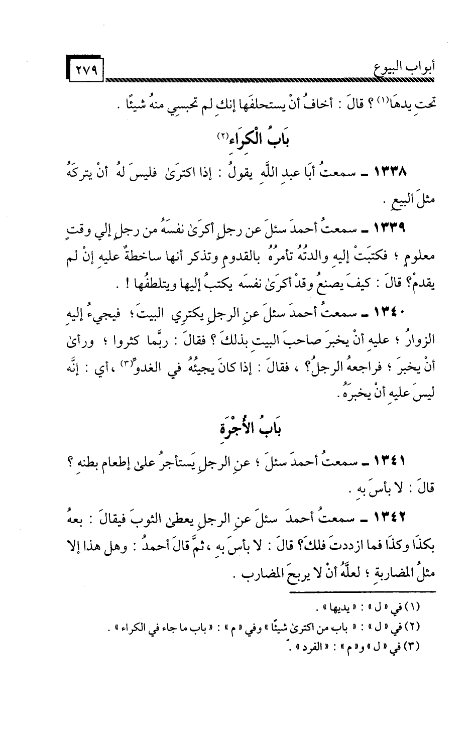 1340 - سَمِعْتُ أَحْمَدَ،» سُئِلَ عَنِ الرَّجُلِ يَكْتَرِي الْبَيْتَ، فَيَجِيءُ إِلَيْهِ الزُّوَّارُ، عَلَيْهِ أَنْ يُخْبِرَ صَاحِبَ الْبَيْتِ بِذَلِكَ؟ فَقَالَ: رُبَّمَا كَثُرُوا، وَرَأَى أَنْ يُخْبِرَ، فَرَاجَعَهُ الرَّجُلُ؟ فَقَالَ: إِذَا كَانَ يَجِيئُهُ فِي الْغُدُوِّ، أَيْ: إِنَّهُ لَيْسَ عَلَيْهِ أَنْ يُخْبِرَهُ ".