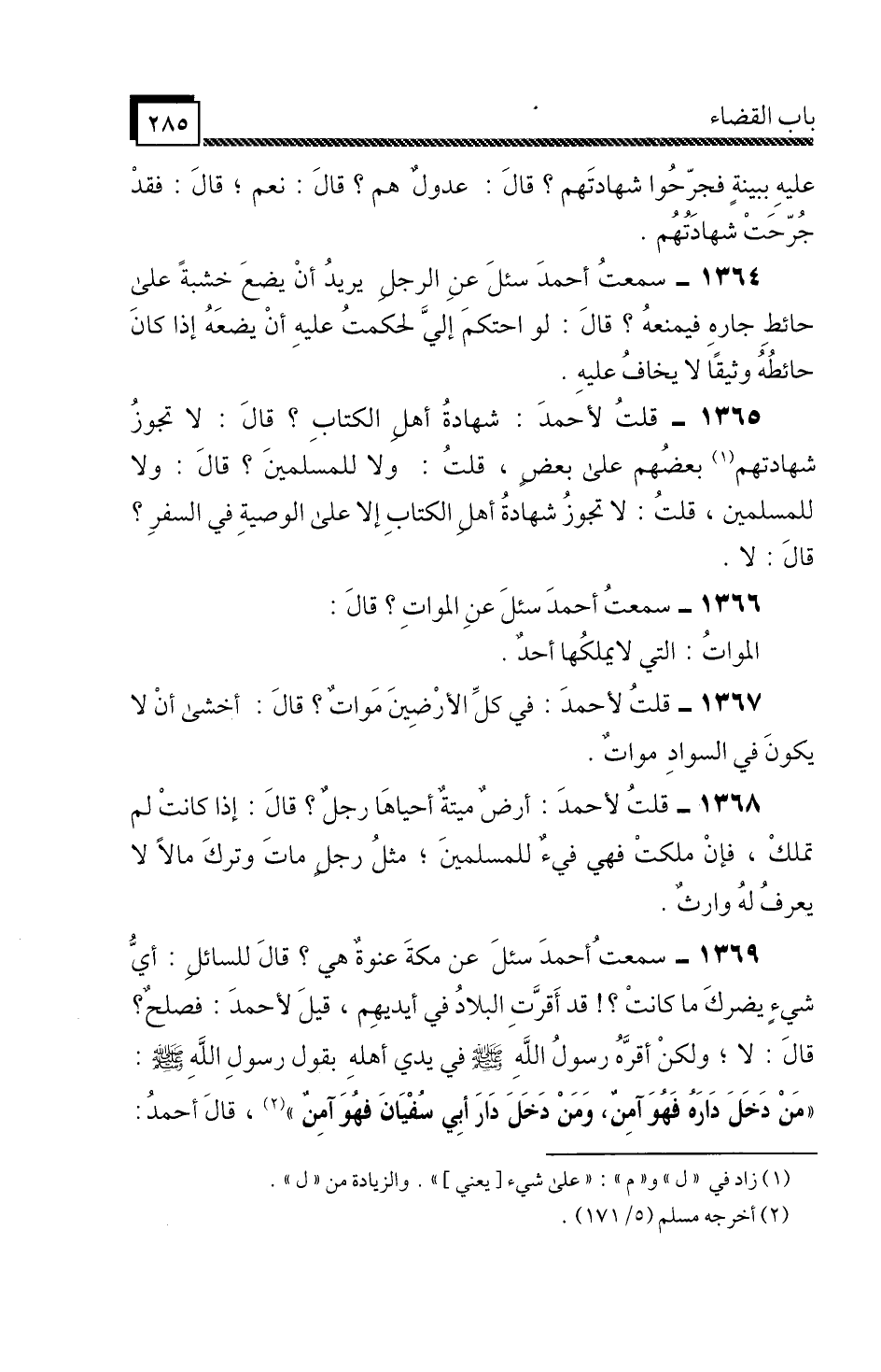 1364 - سَمِعْتُ أَحْمَدَ،» سُئِلَ عَنِ الرَّجُلِ يُرِيدُ أَنْ يَضَعَ خَشَبَةً عَلَى حَائِطِ جَارِهِ فَيَمْنَعُهُ؟ قَالَ: لَوِ احْتَكَمَ إِلَيَّ لَحَكَمْتُ عَلَيْهِ أَنْ يَضَعَهُ، إِذَا كَانَ حَائِطُهُ وَثِيقًا لَا يُخَافُ عَلَيْهِ «.