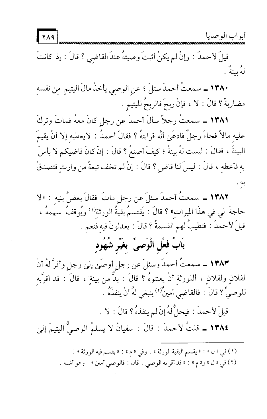 1383 - سَمِعْتُ أَحْمَدَ، " وَسُئِلَ عَنْ رَجُلٍ أَوْصَى إِلَى رَجُلٍ، وَأَقَرَّ لَهُ أَنْ لِفُلَانٍ وَلِفُلَانٍ، أَلِلْوَرَثَةِ أَنْ يُعَنِّتُوهُ؟ قَالَ: بُدٌّ مِنْ بَيِّنَةٍ، قَالَ: قَدْ أَقَرَّ بِهِ لِلْوَصِيِّ؟ قَالَ: فَالْقَاضِي أَمِينٌ يَنْبَغِي لَهُ أَنْ يُنْفِذَهُ، قِيلَ لِأَحْمَدَ: فَيَحِلُّ لَهُ إِنْ لَمْ يُنْفِذْهُ؟ قَالَ: لَا «.