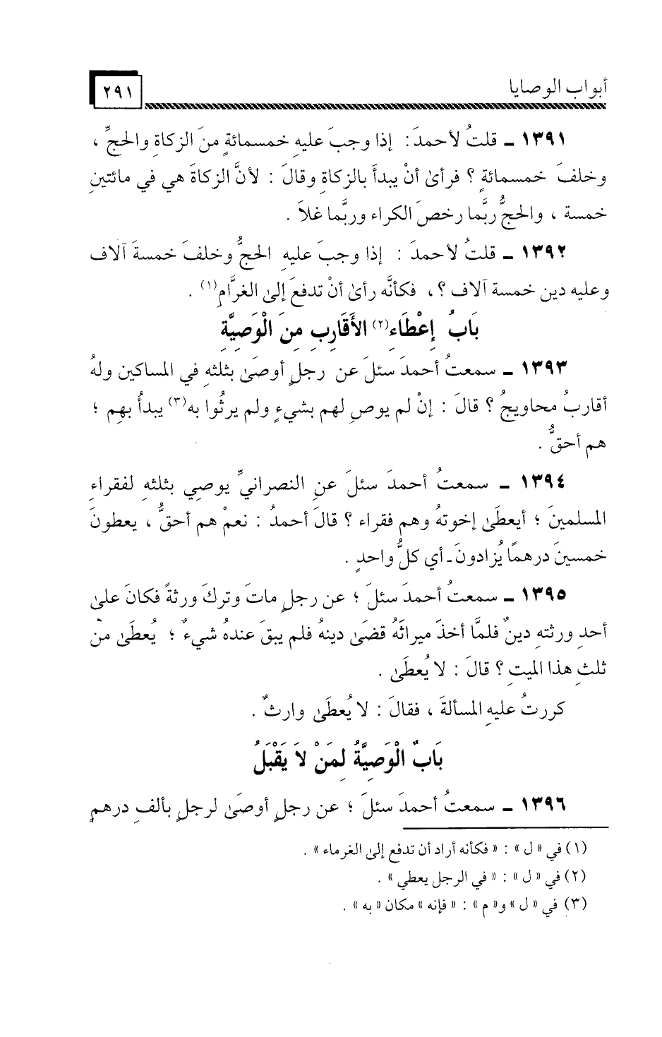1396 - سَمِعْتُ أَحْمَدَ، " سُئِلَ عَنْ رَجُلٍ أَوْصَى لِرَجُلٍ بِأَلْفِ دِرْهَمٍ،
