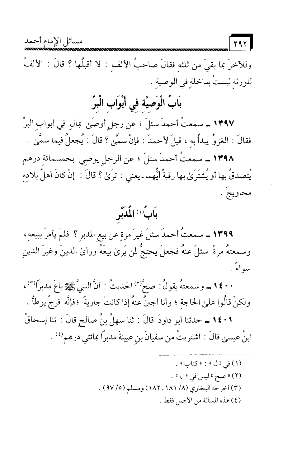1398 - سَمِعْتُ أَحْمَدَ،» سُئِلَ عَنِ الرَّجُلِ يُوصِي بِخَمْسِ مِائَةِ دِرْهَمٍ، يُتَصَدَّقُ بِهَا أَوْ يُشْتَرَى بِهَا رَقَبَةٌ، أَيُّهُمَا، يَعْنِي: تَرَى؟ قَالَ: إِنْ كَانَ أَهْلُ بِلَادِهِ مَحَاوِيجَ ".
