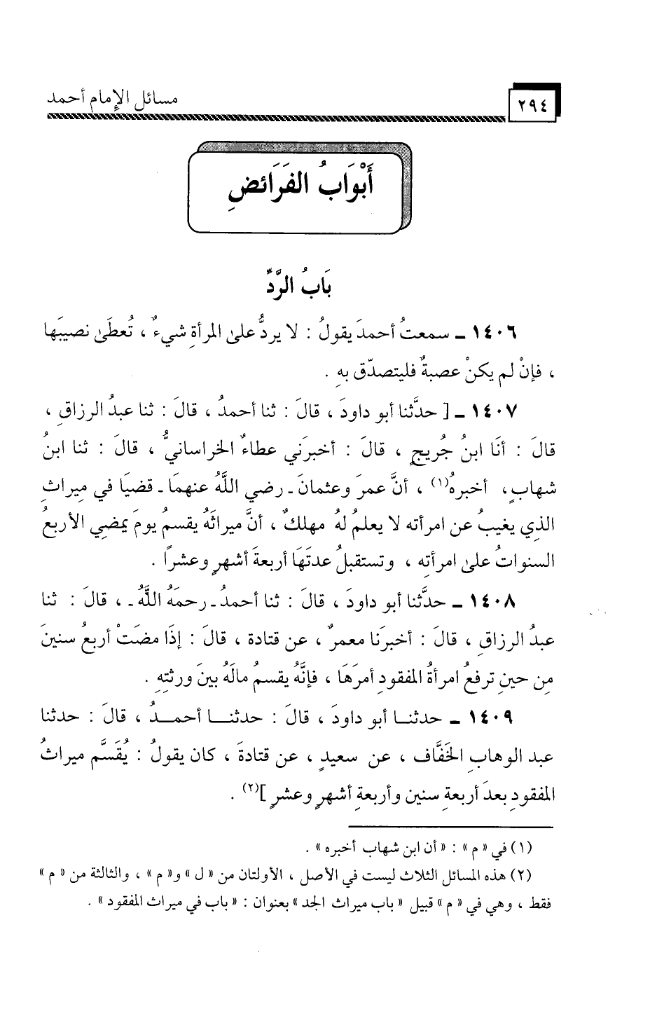 1406 - سَمِعْتُ أَحْمَدَ، يَقُولُ: «لَا يُرَدُّ عَلَى الْمَرْأَةِ شَيْءٌ، تُعْطَى نَصِيبَهَا، فَإِنْ لَمْ يَكُنْ عَصَبَةٌ فَلْيُتَصَدَّقْ بِهِ» .