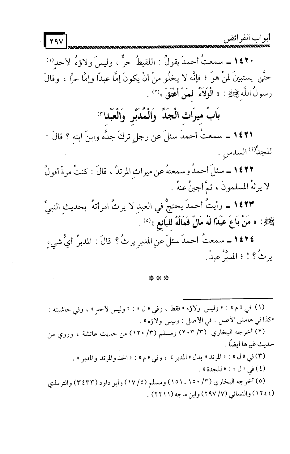1423 - رَأَيْتُ أَحْمَدَ، يَحْتَجُّ فِي الْعَبْدِ لَا يَرِثُ امْرَأَتَهُ بِحَدِيثِ النَّبِيِّ صَلَّى اللَّهُ عَلَيْهِ وَسَلَّمَ: «مَنْ بَاعَ عَبْدًا لَهُ مَالٌ فَمَالُهُ لِلْبَائِعِ»