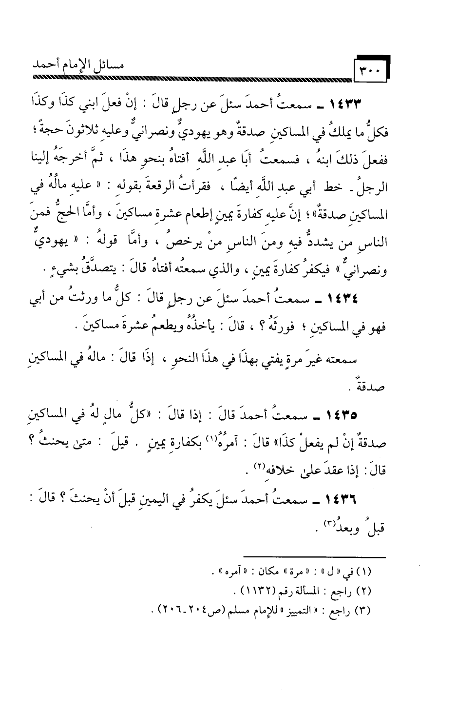 1433 - «سَمِعْتُ أَحْمَدَ،» سُئِلَ عَنْ رَجُلٍ، قَالَ: إِنْ فَعَلَ ابْنِي كَذَا وَكَذَا فَكُلُّ مَا يَمْلِكُ فِي الْمَسَاكِينِ صَدَقَةٌ، وَهُوَ يَهُودِيٌّ وَنَصْرَانِيٌّ وَعَلَيْهِ ثَلَاثُونَ حَجَّةً، فَفَعَلَ ذَلِكَ ابْنُهُ، فَسَمِعْتُ أَبَا عَبْدِ اللَّهِ أَفْتَاهُ بِنَحْوِ هَذَا، ثُمَّ أَخْرَجَهُ إِلَيْنَا الرَّجُلُ، خَطُّ أَبِي عَبْدِ اللَّهِ أَيْضًا، فَقَرَاتُ الرُّقْعَةُ بِقَوْلِهِ: عَلَيْهِ مَالُهُ فِي الْمَسَاكِينِ صَدَقَةٌ، إِنَّ عَلَيْهِ كَفَّارَةَ يَمِينٍ إِطْعَامَ عَشْرَةِ مَسَاكِينَ، وَأَمَّا الْحَجُّ، فَمِنَ النَّاسِ مَنْ يُشَدِّدُ فِيهِ، وَمِنَ النَّاسِ مَنْ يُرَخِّصُ، وَأَمَّا قَوْلُهُ: يَهُودِيٌّ وَنَصْرَانِيٌّ فَيُكَفِّرُ كَفَّارَةَ يَمِينٍ، وَالَّذِي سَمِعْتُهُ أَفْتَاهُ، قَالَ: يَتَصَدَّقُ بِشَيْءٍ «.