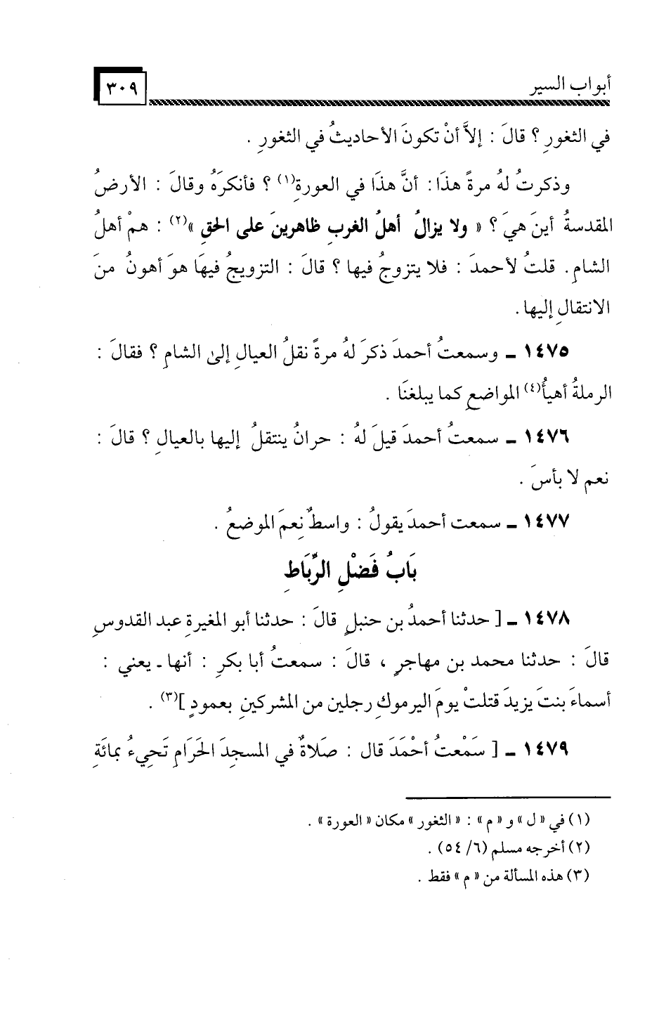 وَذَكَرْتُ لَهُ مَرَّةً هذَا: أَنَّ هَذَا فِي الْعَوْرَةِ، فَأَنْكَرَهُ، وَقَالَ: الْأَرْضُ الْمُقَدَّسَةُ أَيْنَ هِيَ؟ «وَلَا يَزَالُ أَهْلُ الْعَرَبِ ظَاهِرِينَ عَلَى الْحَقِّ» : هُمْ أَهْلُ الشَّامِ، قُلْتُ لِأَحْمَدَ: فَلَا يَتَزَوَّجُ فِيهَا؟ قَالَ: التَّزْوِيجُ فِيهَا هُوَ أَهْوَنُ مِنَ الِانْتِقَالِ إِلَيْهَا.