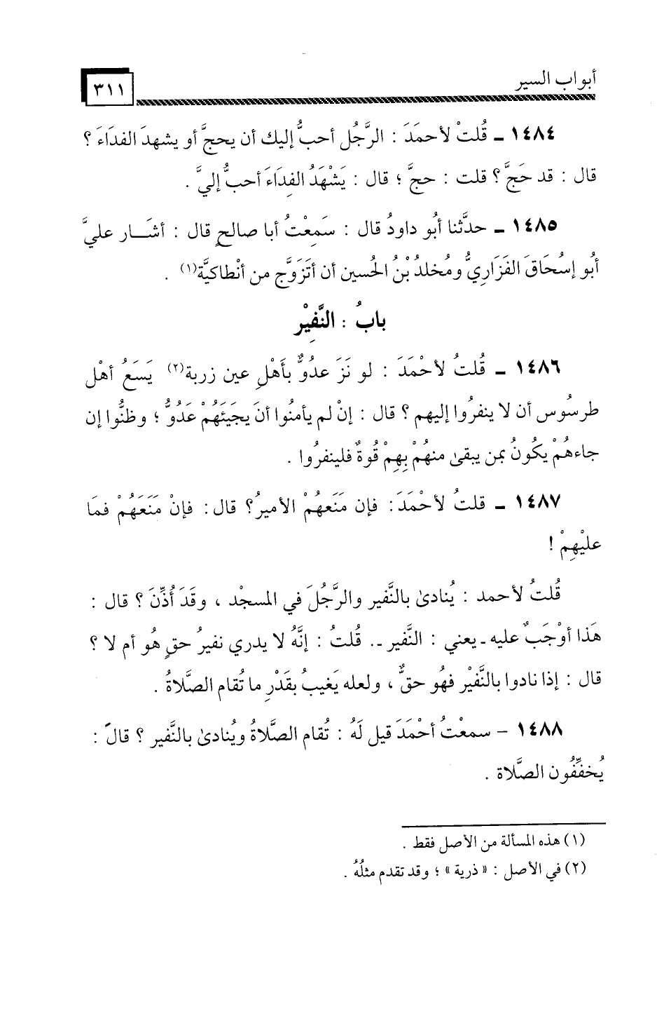1487 - قُلْتُ لِأَحْمَدَ: فَإِنْ مَنَعَهُمُ الْأَمِيرُ؟ قَالَ: فَإِنْ مَنَعَهُمْ فَمَا عَلَيْهِمْ! قُلْتُ لِأَحْمَدَ " يُنَادَى بِالنَّفيرِ وَالرَّجُلَ فِي الْمَسْجِدِ، وَقَدْ أُذِّنَ؟ قَالَ: هَذَا أَوْجَبُ عَلَيْهِ، يَعْنِي: النَّفِيرَ، قُلْتُ: إِنَّهُ لَا يَدْرِي نَفِيرُ حَقٍّ هُوَ أَمْ لَا؟ قَالَ: إِذَا نَادُوا بِالنَّفِيرِ فَهُوَ حَقٌّ، وَلَعَلَّهُ يَغِيبُ بِقَدْرِ مَا تُقَامُ الصَّلَاةُ «.