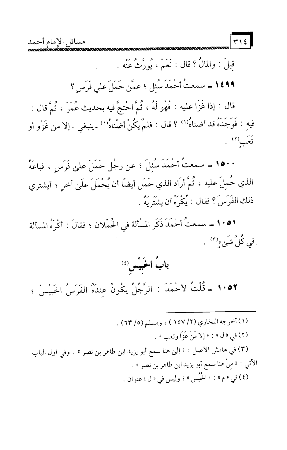 1500 - سَمِعْتُ أَحْمَدَ،» سُئِلَ عَنْ رَجُلٍ حَمَلَ عَلَى فَرَسٍ، فَبَاعَهُ الَّذِي حُمِلَ عَلَيْهِ، ثُمَّ أَرَادَ الَّذِي حَمَلَ أَيْضًا أَنْ يُحْمَلَ عَلَى أَخَرَ، أَيَشْتَرِي ذَلِكَ الْفَرَسَ؟ فَقَالَ: يُكْرَهُ أَنْ يَشْتَرِيَهُ «.