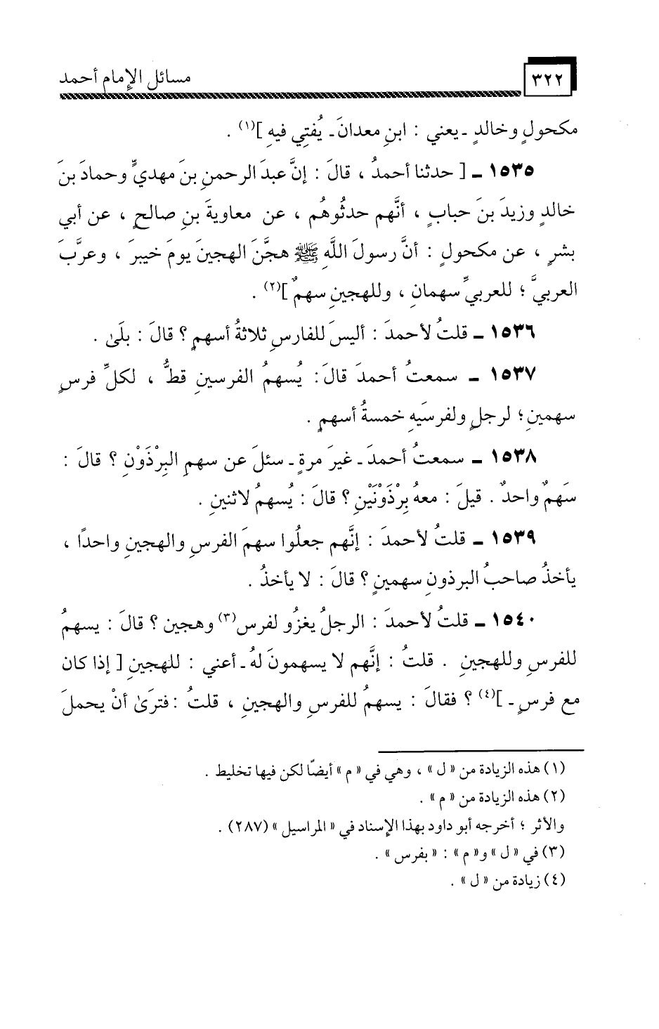 1539 - قُلْتُ لِأَحْمَدَ» إِنَّهُمْ جَعَلُوا سَهْمَ الْفَرَسِ وَالْهَجِينِ وَاحِدًا، يَأْخُذُ صَاحِبُ الْبِرْذَوْنِ سَهْمَيْنٍ؟ قَالَ: لَا يَأْخُذُ «.