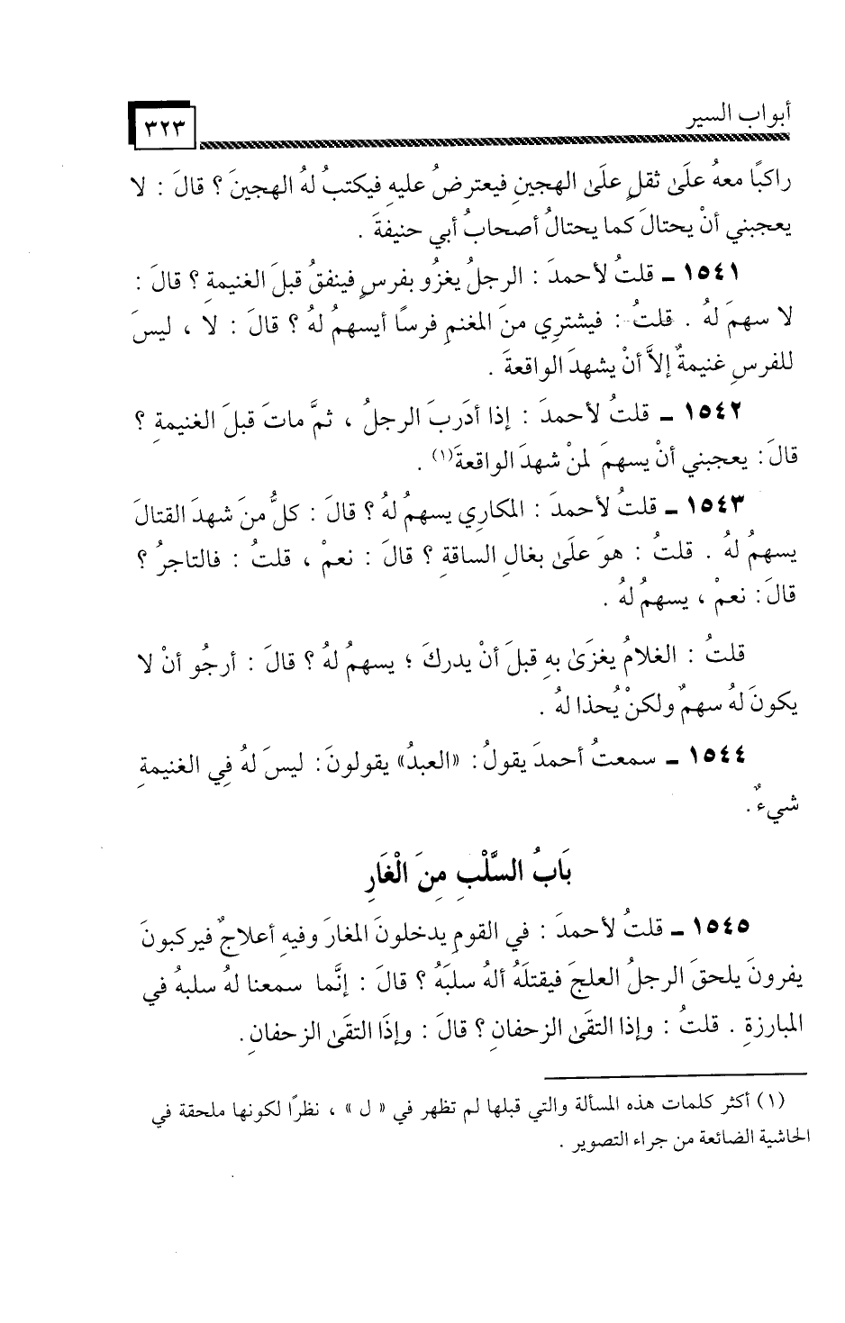 1545 - قُلْتُ لِأَحْمَدَ: فِي الْقَوْمِ يَدْخُلُونَ الْمُغَارِ، وَفِيهِ أَعْلَاجٌ، فَيَرْكَبُونَ يَفِرُّونَ، يَلْحَقُ الرَّجُلُ الْعِلْجَ، فَيَقْتُلُهُ أَلَهُ سَلَبُهُ؟ قَالَ: إِنَّمَا سَمِعْنَا لَهُ سَلَبُهُ فِي الْمُبَارَزَةِ، قُلْتُ: وَإِذَا الْتَقَى الزَّحْفَانِ؟ قَالَ: وَإِذَا الْتَقَى الزَّحْفَانِ ".