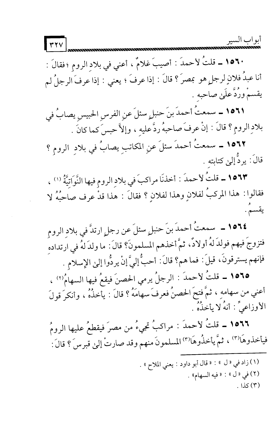 1563 - قُلْتُ لِأَحْمَدَ» أَخَذْنَا مَرَاكِبَ فِي بِلَادِ الرُّومِ فِيهَا النَّوَاتِيَّةُ، فَقَالُوا: هَذَا الْمَرْكِبُ لِفُلَانٍ وَهَذَا لِفُلَانٍ؟ فَقَالَ: هَذَا قَدْ عُرِفَ صَاحِبُهُ لَا يُقَسَّمُ «.