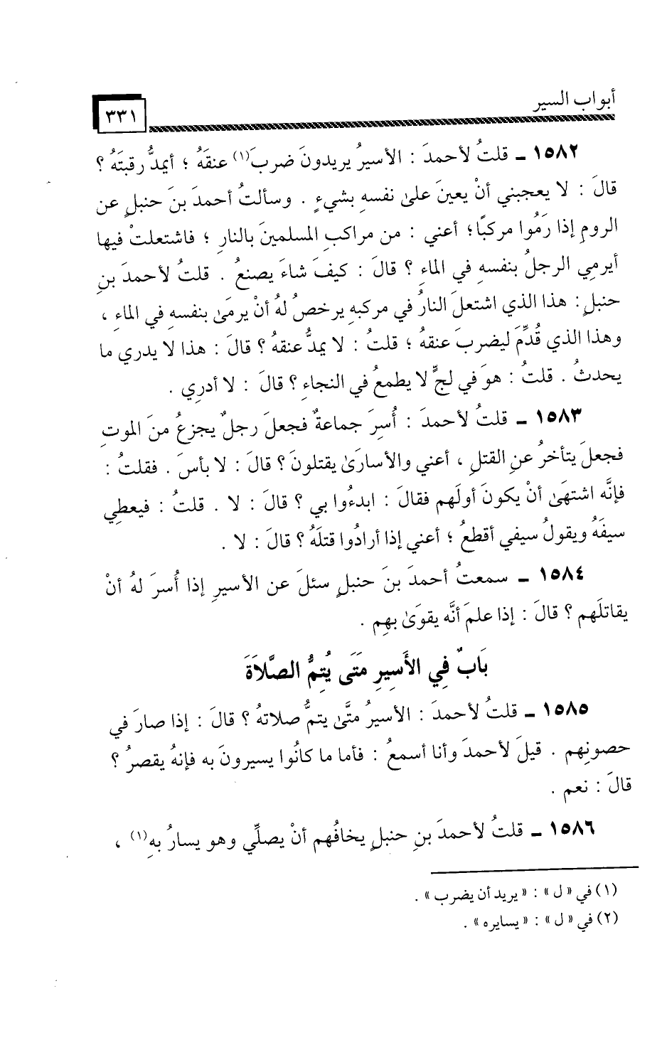 1582 - قُلْتُ لِأَحْمَدَ» الْأَسِيرُ يُرِيدُونَ ضَرْبَ عُنُقَهُ، أَيَمُدُّ رَقَبَتَهُ؟ قَالَ: لَا يُعْجِبُنِي أَنْ يُعِينَ عَلَى نَفْسِهِ بِشَيْءٍ، وَسَأَلْتُ أَحْمَدَ بْنَ حَنْبَلٍ عَنِ الرُّومِ إِذَا رَمَوْا مَرْكِبًا، أَعْنِي: مِنْ مَرَاكِبِ الْمُسْلِمِينَ بِالنَّارِ، فَاشْتَعَلَتْ فِيهَا، أَيَرْمِي الرَّجُلُ بِنَفْسِهِ فِي الْمَاءِ؟ قَالَ: كَيْفَ شَاءَ يَصْنَعُ، قُلْتُ لِأَحْمَدَ بْنِ حَنْبَلٍ: هَذَا الَّذِي اشْتَعَلَ النَّارُ فِي مَرْكِبِهِ يُرَخَّصُ لَهُ أَنْ يَرْمِيَ بِنَفْسِهِ فِي الْمَاءِ، وَهَذَا الَّذِي قُدِّمَ لِيُضْرَبَ عُنُقُهُ، قُلْتُ: لَا يَمُدُّ عُنُقَهُ؟ قَالَ: هَذَا لَا يَدْرِي مَا يَحْدُثُ، قُلْتُ: هُوَ فِي لُجٍّ، لَا يَطْمَعُ فِي النَّجَاءِ؟ قَالَ: لَا أَدْرِي «.