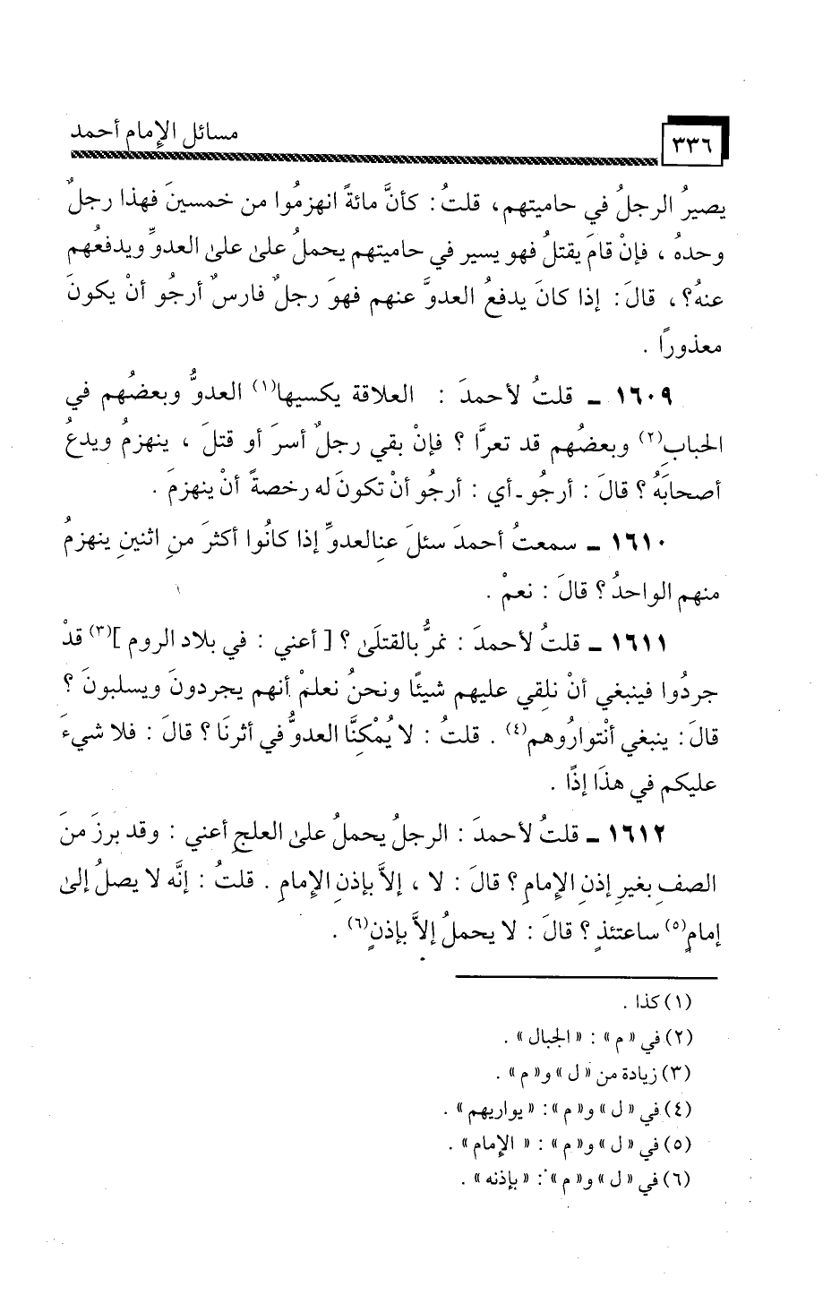 1610 - سَمِعْتُ أَحْمَدَ،» سُئِلَ عَنِ الْعَدُوِّ إِذَا كَانُوا أَكْثَرَ مِنَ اثْنَيْنِ، يَنْهَزِمُ مِنْهُمُ الْوَاحِدُ؟ قَالَ: نَعَمْ ".