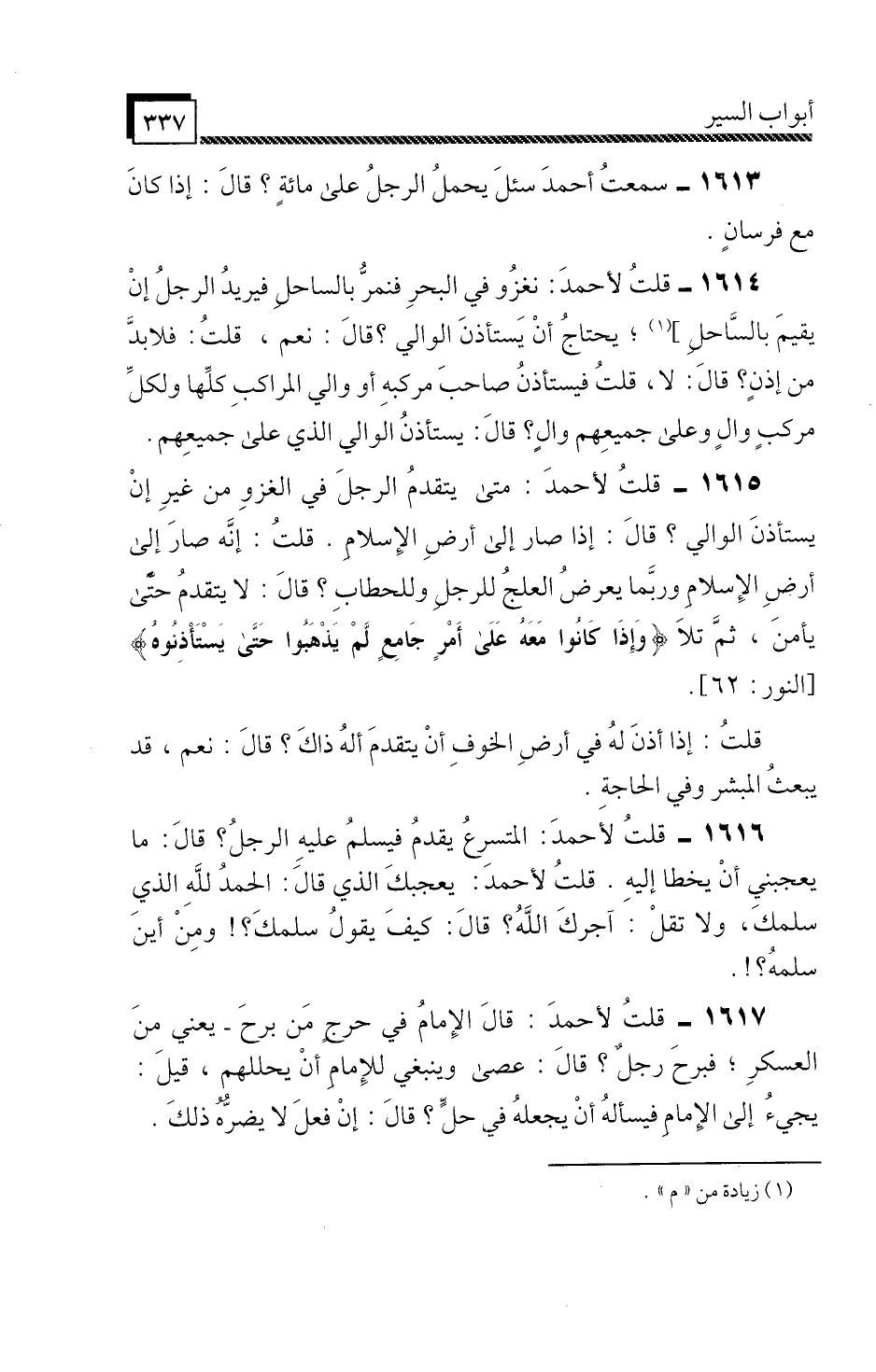 1614 - قُلْتُ لِأَحْمَدَ» نَغْزُو فِي الْبَحْرِ، فَنَمُرُّ بِالسَّاحِلِ فَيُرِيدُ الرَّجُلُ أَنْ يُقِيمَ بِالسَّاحِلِ، يَحْتَاجُ أَنْ يَسْتَأْذِنَ الْوَالِيَ؟ قَالَ: نَعَمْ، قُلْتُ: فَلَابُدَّ مِنْ إِذْنٍ؟ قَالَ: لَا، قُلْتُ: فَيَسْتَأْذِنُ صَاحِبَ مَرْكِبِهِ، أَوْ وَالِيَ الْمَرَاكِبِ كُلِّهَا، وَلُكِلِّ مَرْكِبٍ وَالٍ، وَعَلَى جَمِيعِهِمْ وَالٍ؟ قَالَ: يَسْتَأْذِنُ الْوَالِي الَّذِي عَلَى جَمِيعِهِمْ «.