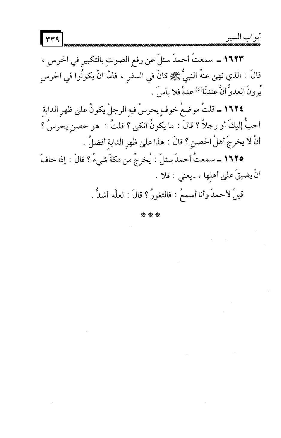 1623 - سَمِعْتُ أَحْمَدَ،» سُئِلَ عَنْ رَفْعِ الصَّوْتِ بِالتَّكْبِيرِ فِي الْحَرَسِ، قَالَ: الَّذِي نَهَى عَنْهُ النَّبِيُّ صَلَّى اللَّهُ عَلَيْهِ وَسَلَّمَ كَانَ فِي السَّفَرِ، فَأَمَّا أَنْ يَكُونُوا فِي الْحَرَسِ، يُرُونَ الْعَدُوَّ أَنَّ عِنْدَنَا عُدَّةً فَلَا بَأْسَ "