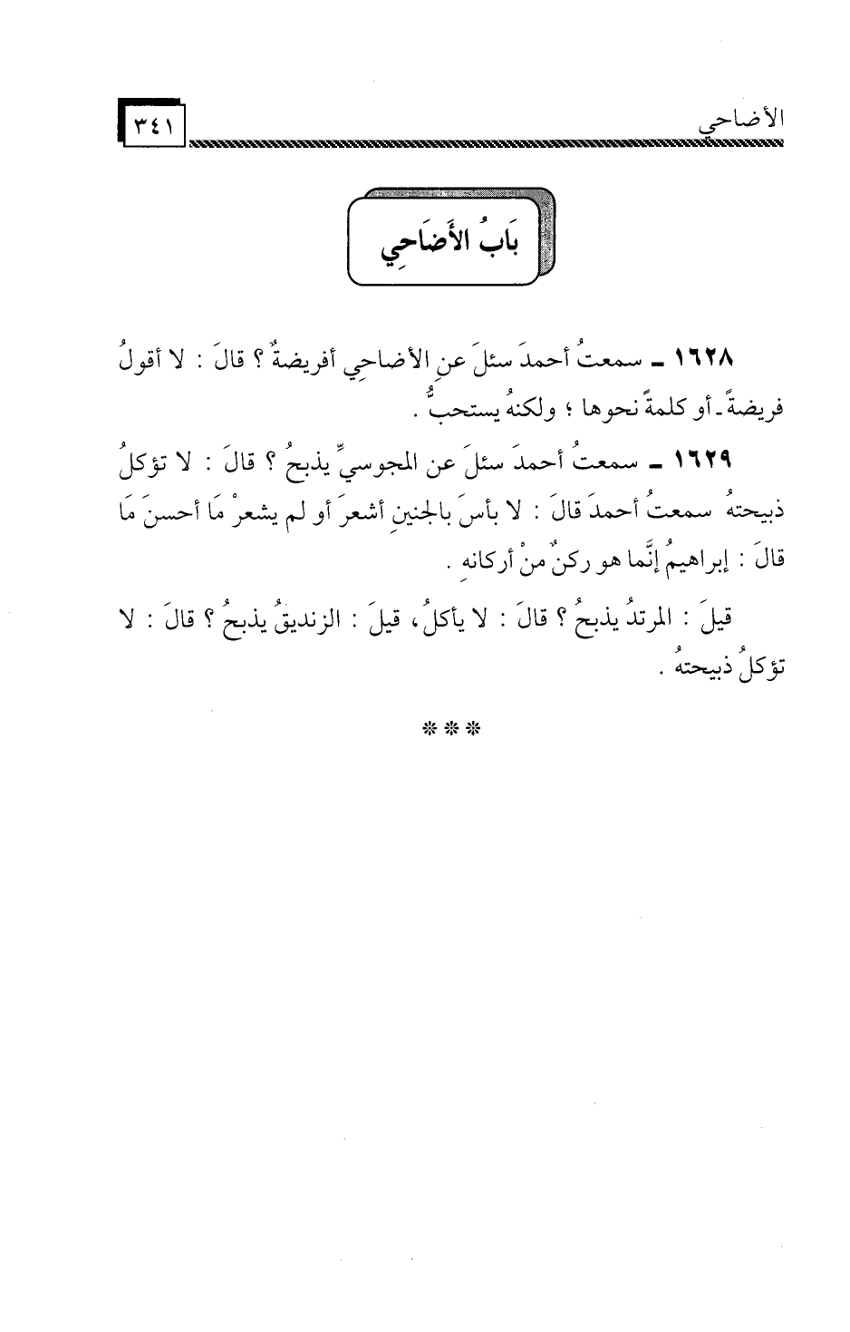 1628 - سَمِعْتُ أَحْمَدَ، " سُئِلَ عَنِ الْأَضَاحِي أَفَرِيضَةٌ؟ قَالَ: لَا أَقُولُ: فَرِيضَةً، أَوْ كَلِمَةً نَحْوَهَا، وَلَكِنَّهُ يُسْتَحَبُّ «.