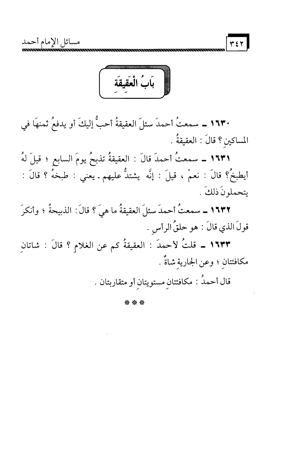 1632 - سَمِعْتُ أَحْمَدَ، سُئِلَ» الْعَقِيقَةُ مَا هِيَ؟ قَالَ: الذَّبِيحَةُ، وَأَنْكَرَ قَوْلَ الَّذِي قَالَ: هُوَ حَلْقُ الرَّأْسِ «.