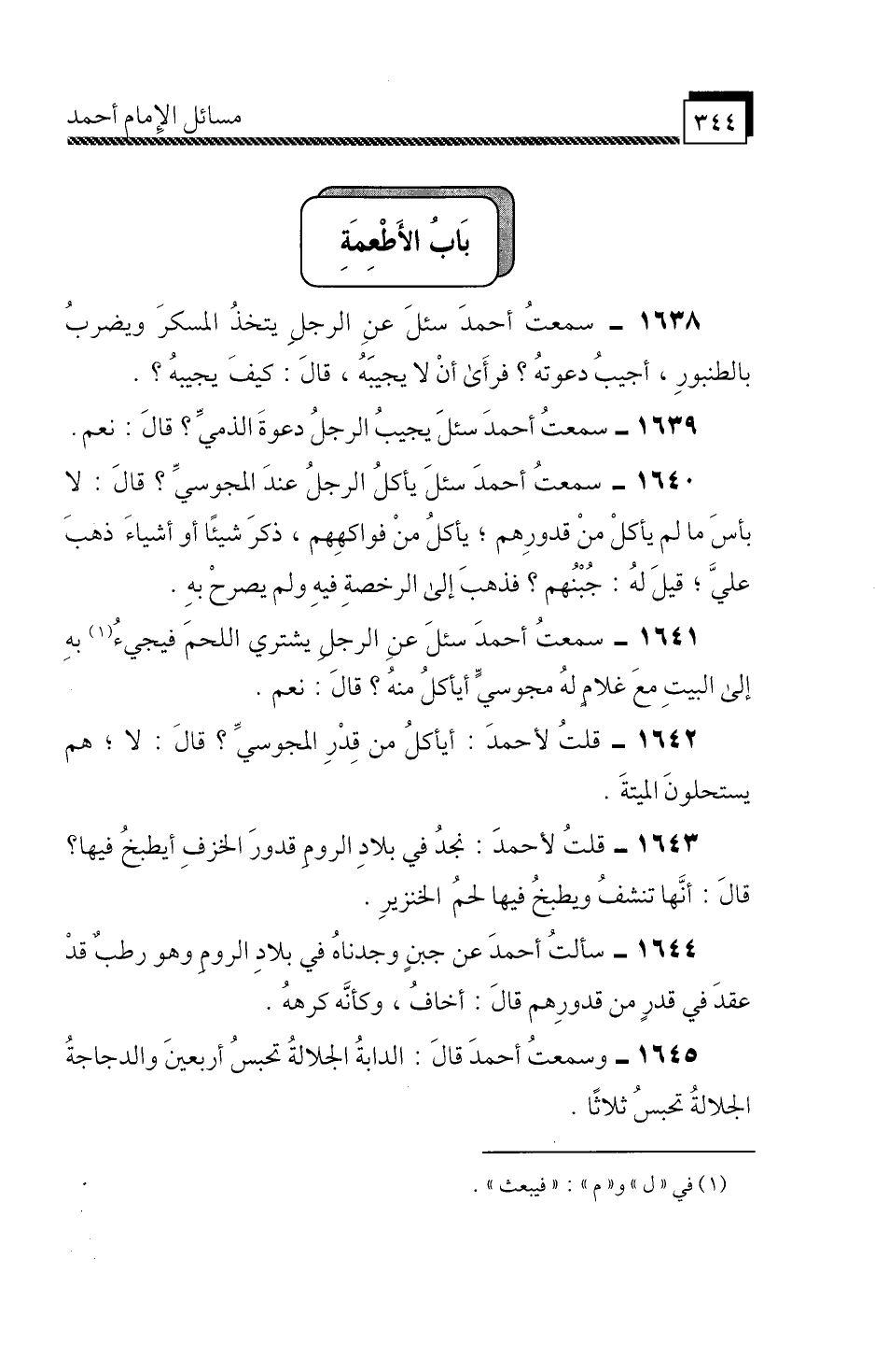1640 - «سَمِعْتُ أَحْمَدَ، سُئِلَ» يَأْكُلُ الرَّجُلُ عِنْدَ الْمَجُوسِيِّ؟ قَالَ: لَا بَأْسَ، مَا لَمْ يَأْكُلْ مِنْ قُدُورِهِمْ، يَأْكُلُ مِنْ فَوَاكِهِهِمْ، ذَكَرَ شَيْئًا أَوْ أَشْيَاءَ ذَهَبَ عَلَيَّ، قِيلَ لَهُ: جُبْنُهُمْ؟ فَذَهَبَ إِلَى الرُّخْصَةِ فِيهِ، وَلَمْ يُصِرِّحْ بِهِ «.