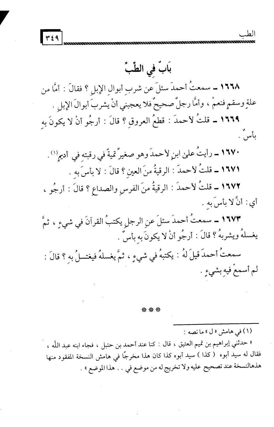 1668 - سَمِعْتُ أَحْمَدَ، " سُئِلَ عَنْ شُرْبِ أَبْوَالِ الْإِبِلِ؟ فَقَالَ: أَمَّا مِنْ عِلَّةٍ وَسَقَمٍ فَنَعَمْ، وَأَمَّا رَجُلٌ صَحِيحٌ، فَلَا يُعْجِبُنِي أَنْ يَشْرَبَ أَبْوَالَ الْإِبِلِ «.