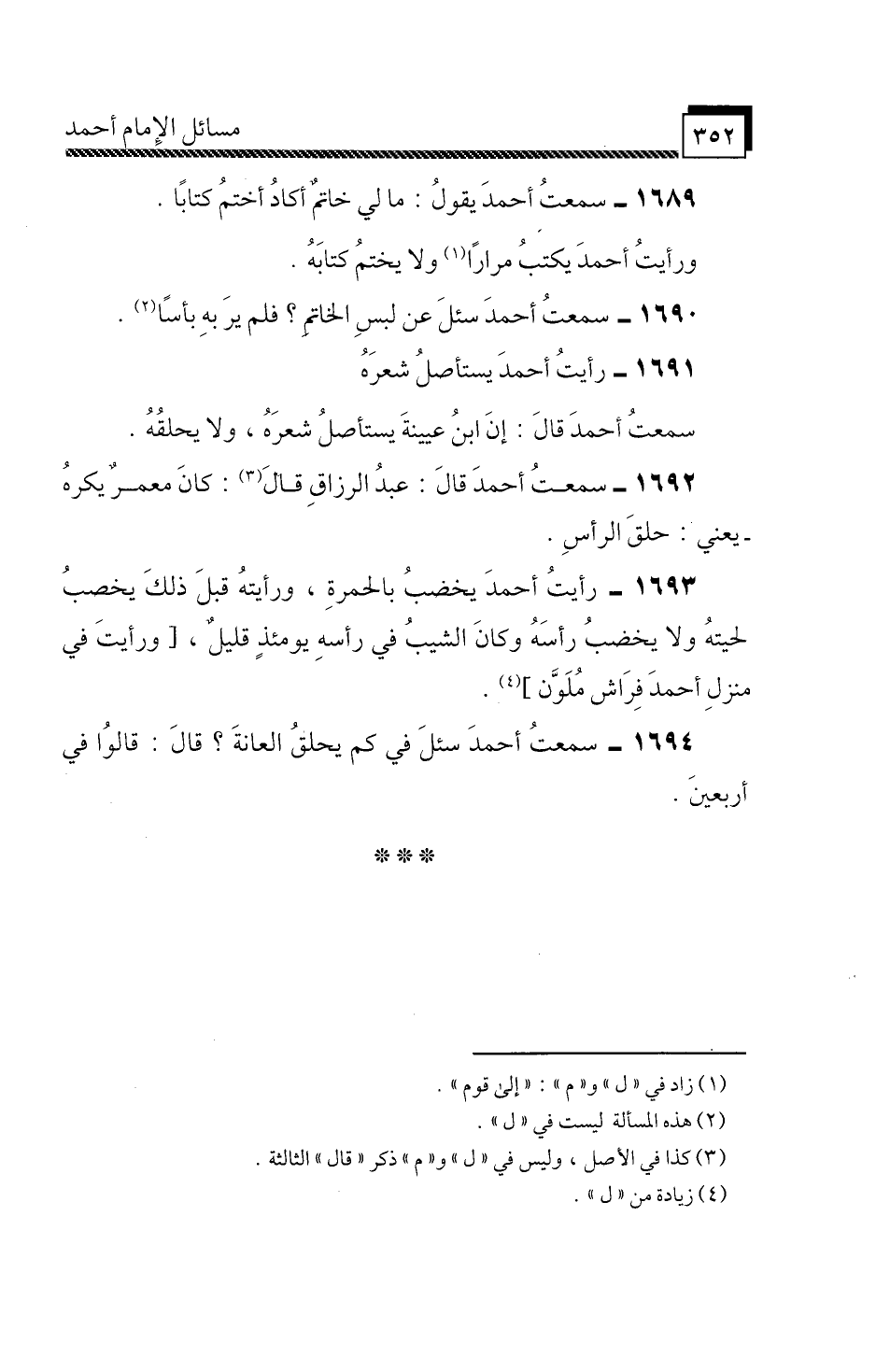1691 - " رَأَيْتُ أَحْمَدَ يَسْتَأْصِلُ شَعَرَهُ، سَمِعْتُ أَحْمَدَ، قَالَ: إِنَّ ابْنَ عُيَيْنَةَ يَسْتَأْصِلُ شَعَرَهُ، وَلَا يَحْلِقُهُ ".