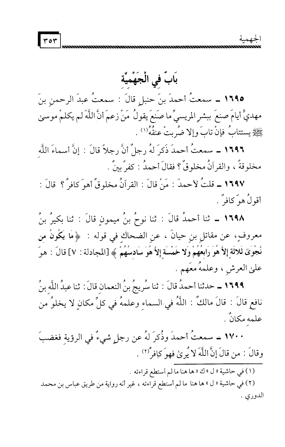 1695 - سَمِعْتُ أَحْمَدَ بْنَ حَنْبَلٍ، قَالَ: سَمِعْتُ عَبْدَ الرَّحْمَنِ بْنَ مَهْدِيٍّ أَيَّامَ صُنِعَ بِبِشْرٍ الْمَرِيسِيِّ مَا صُنِعَ، يَقُولُ: «مَنْ زَعَمَ أَنَّ اللَّهَ لَمْ يُكَلِّمْ مُوسَى صَلَّى اللَّهُ عَلَيْهِ وَسَلَّمَ يُسْتَتَابُ، فَإِنْ تَابَ، وَإِلَّا ضُرِبَتْ عُنُقُهُ» .