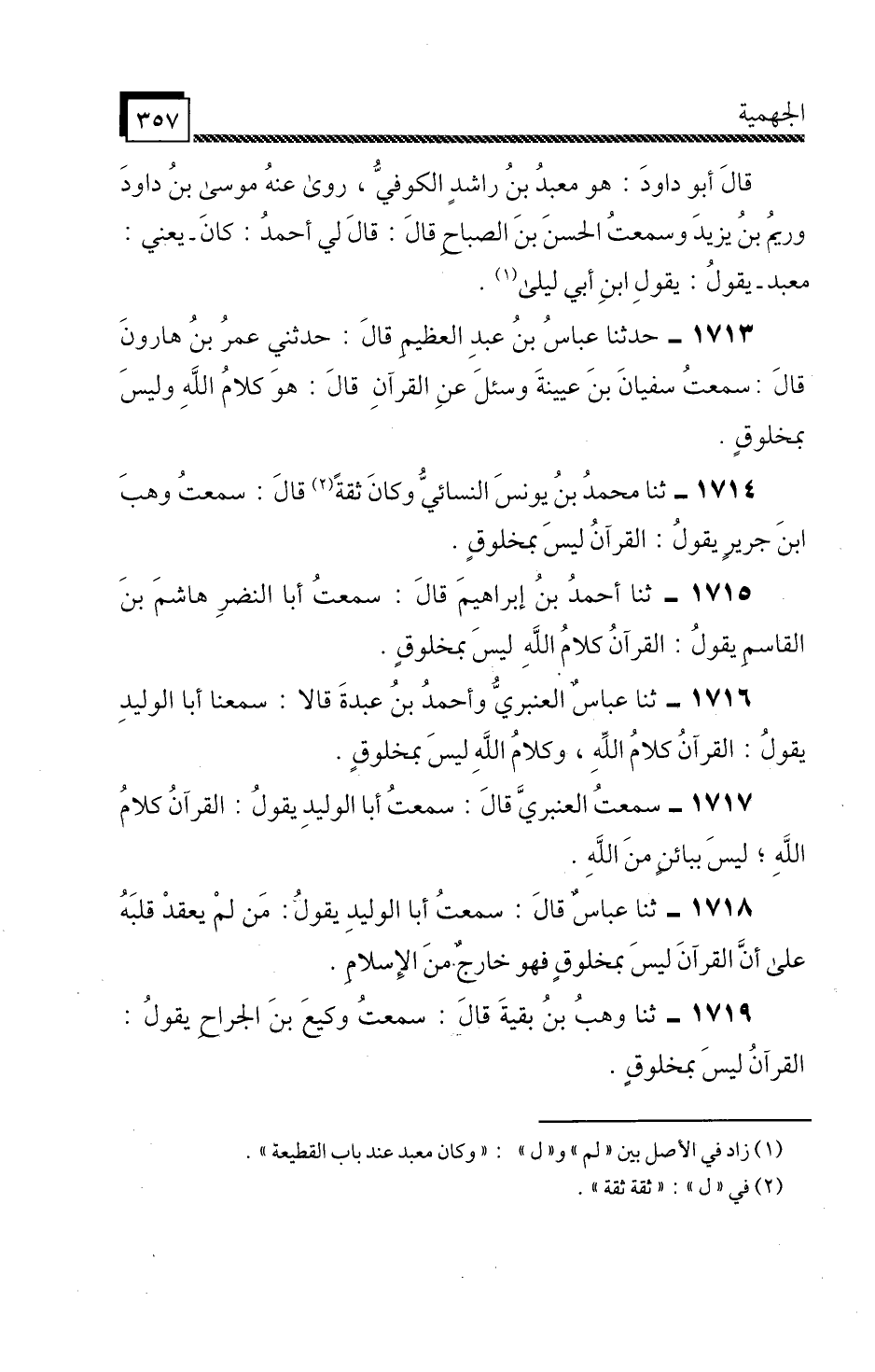 1714 - ثَنَا مُحَمَّدُ بْنُ يُونُسَ النَّسَائِيُّ وَكَانَ ثِقَةً، قَالَ: سَمِعْتُ وَهْبَ بْنَ جَرِيرٍ، يَقُولُ: «الْقُرْآنُ لَيْسَ بِمَخْلُوقٍ» .