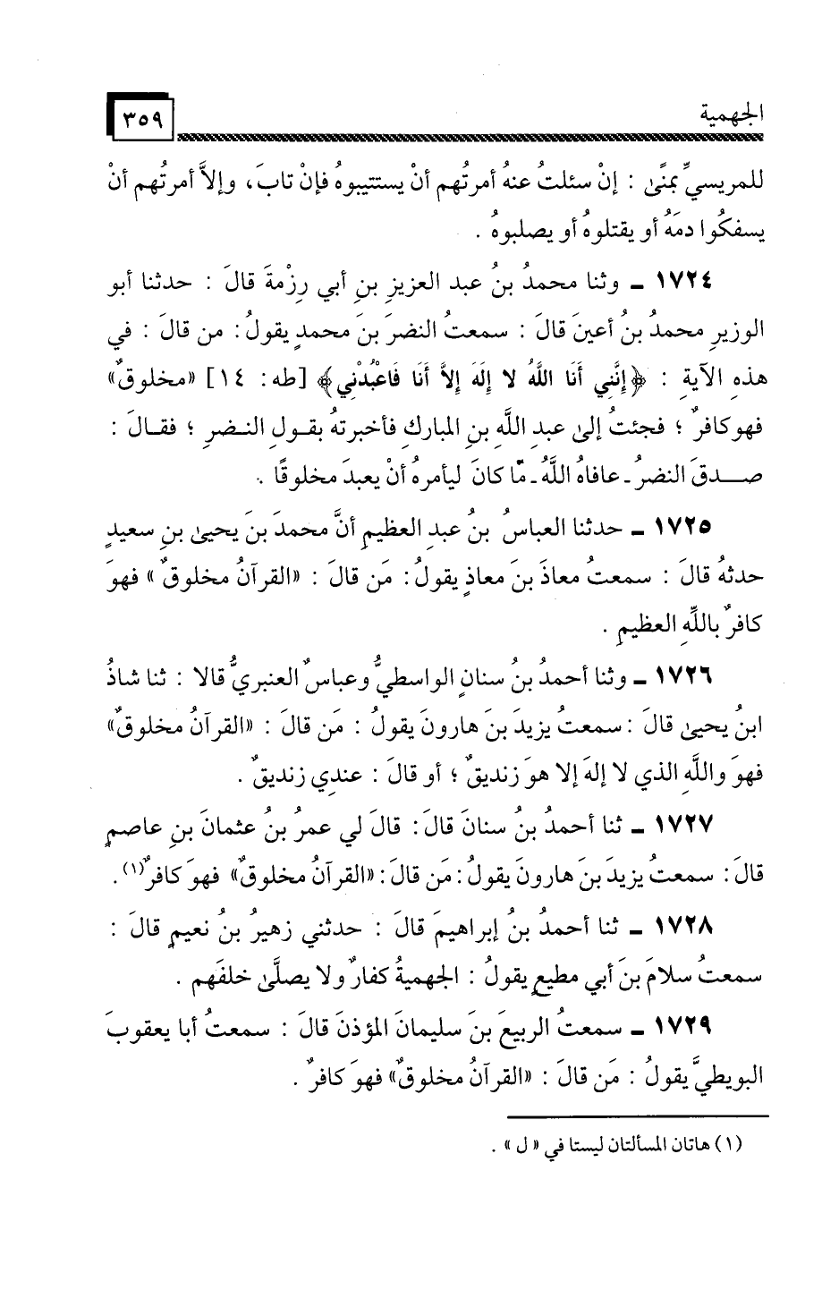 1729 - سَمِعْتُ الرَّبِيعَ بْنَ سُلَيْمَانَ الْمُؤَذِّنَ، قَالَ: سَمِعْتُ أَبَا يَعْقوبَ الْبُوَيْطِيَّ، يَقُولُ: " مَنْ قَالَ: الْقُرْآنُ مَخْلُوقٌ، فَهُوَ كَافِرٌ ".