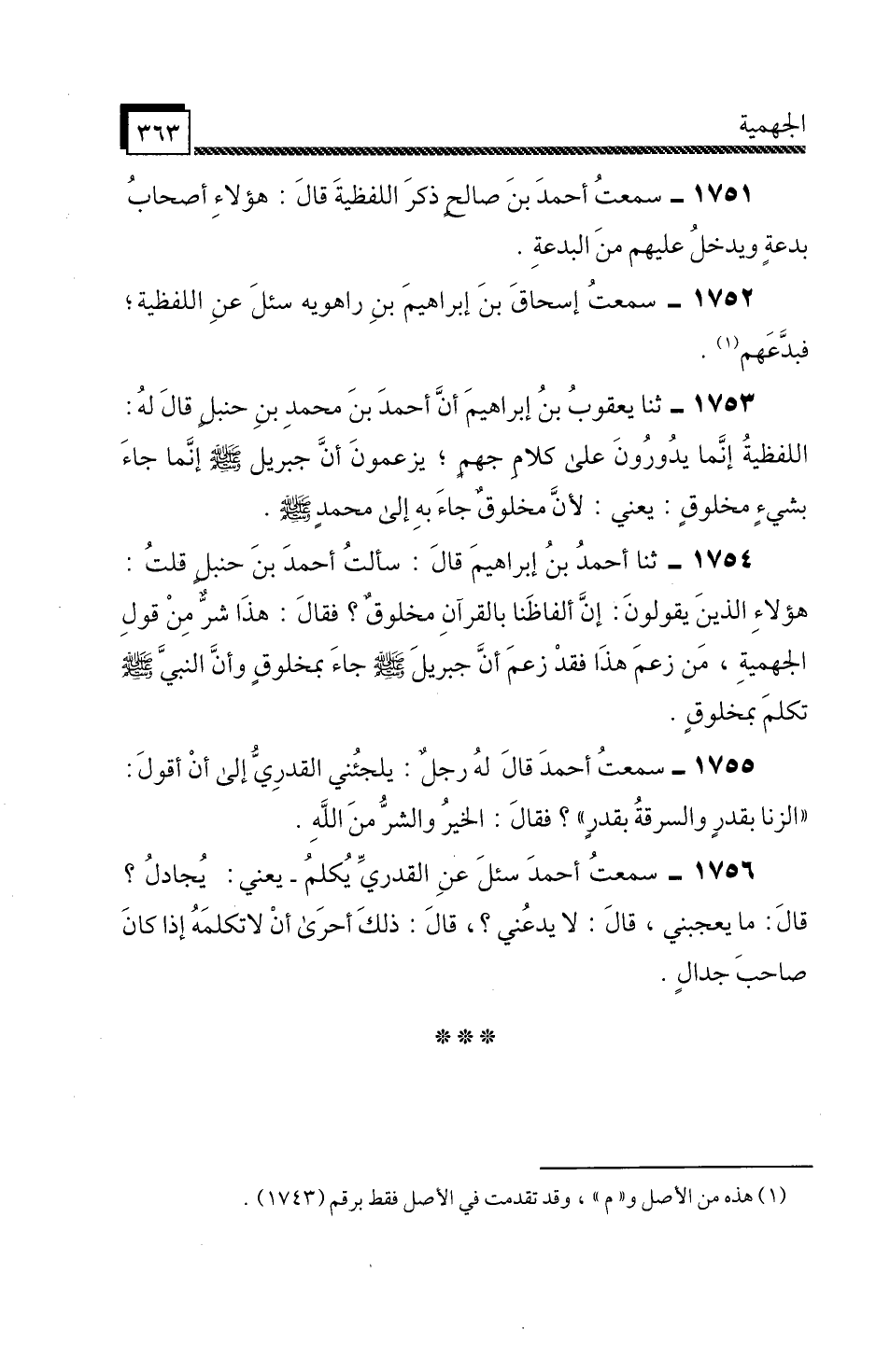 1753 - ثَنَا يَعْقُوبُ بْنُ إِبْرَاهِيمَ، أَنَّ أَحْمَدَ بْنَ مُحَمَّدِ بْنِ حَنْبَلٍ، قَالَ لَهُ» اللَّفْظِيَّةُ إِنَّمَا يَدُورُونَ عَلَى كَلَامِ جَهْمٍ، يَزْعُمُونَ أَنَّ جِبْرِيلَ صَلَّى اللَّهُ عَلَيْهِ وَسَلَّمَ إِنَّمَا جَاءَ بِشَيْءٍ مَخْلُوقٍ، يَعْنِي: لِأَنَّ مَخْلُوقٌ جَاءَ بِهِ إِلَى مُحَمَّدٍ صَلَّى اللَّهُ عَلَيْهِ وَسَلَّمَ ".