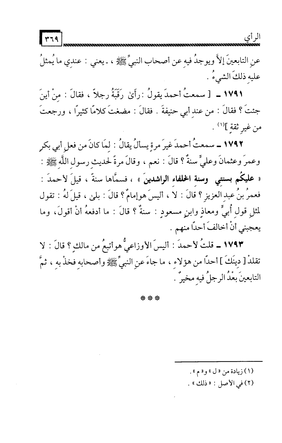 1792 - سَمِعْتُ أَحْمَدَ غَيْرَ مَرَّةٍ، يُسْأَلُ، يُقَالُ: لِمَا كَانَ مِنْ فِعْلِ أَبِي بَكْرٍ وَعُمَرَ وَعُثْمَانَ وَعَلِيٍّ سُنَّةٌ؟ قَالَ: نَعَمْ، وَقَالَ مَرَّةً لِحَدِيثِ رَسُولِ اللَّهِ صَلَّى اللَّهُ عَلَيْهِ وَسَلَّمَ: «عَلَيْكُمْ بِسُنَّتِي وَسُنَّةِ الْخُلَفَاءِ الرَّاشِدِينَ» ، فَسَمَّاهَا سُنَّةً، قِيلَ لِأَحْمَدَ: فَعُمَرُ بْنُ عَبْدِ الْعَزِيزِ؟ قَالَ: لَا، أَلَيْسَ هُوَ إِمَامٌ؟ قَالَ: بَلَى.