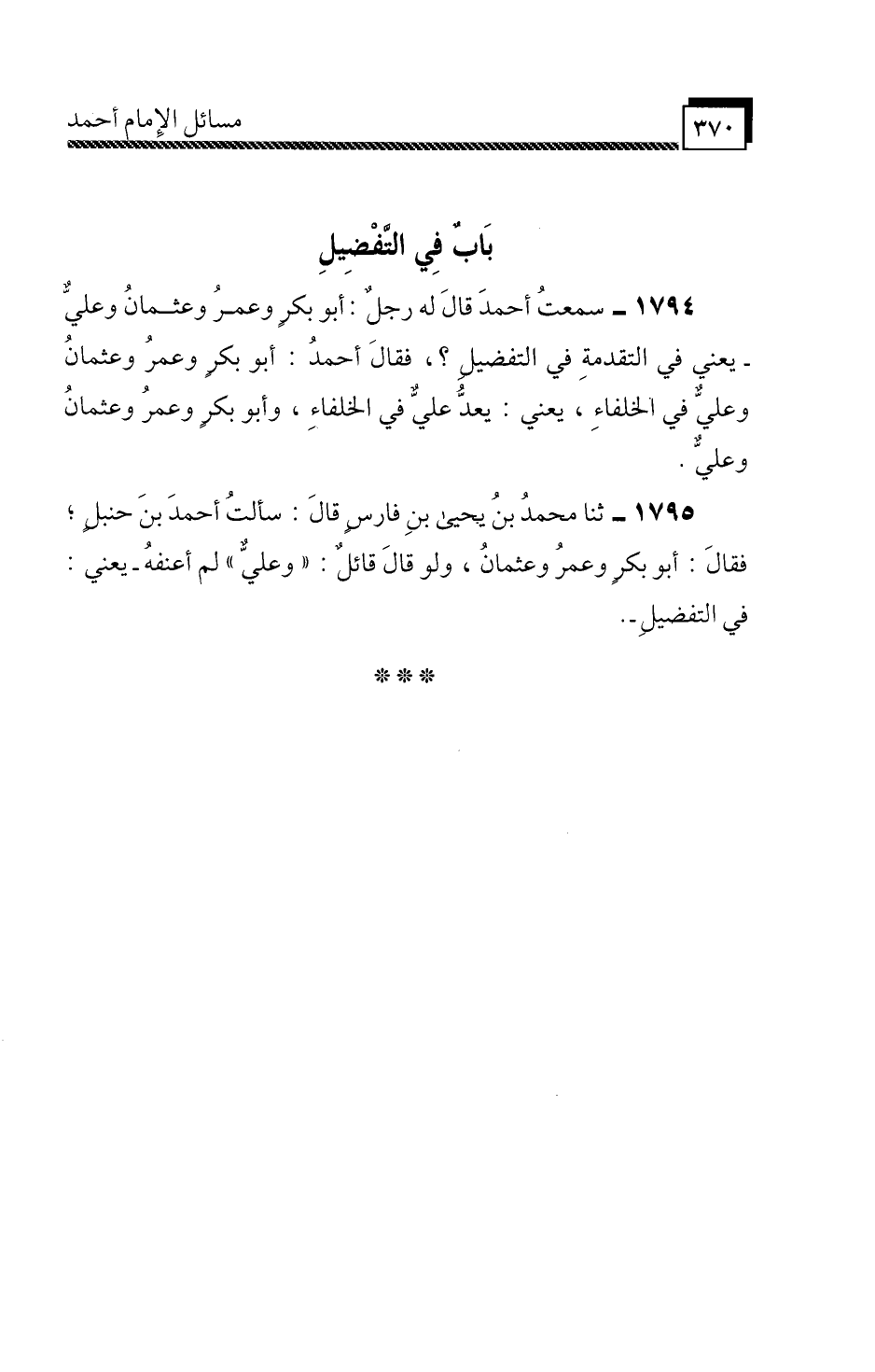 1795 - ثَنَا مُحَمَّدُ بْنُ يَحْيَى بْنِ فَارِسٍ، قَالَ: سَأَلْتُ أَحْمَدَ بْنَ حَنْبَلٍ، فَقَالَ " أَبُو بَكْرٍ وَعُمَرُ وَعُثْمَانُ، وَلَوْ قَالَ قَائِلٌ: وَعَلِيٌّ لَمْ أَعْنُفْهُ، يَعْنِي: فِي التَّفْضِيلِ ".