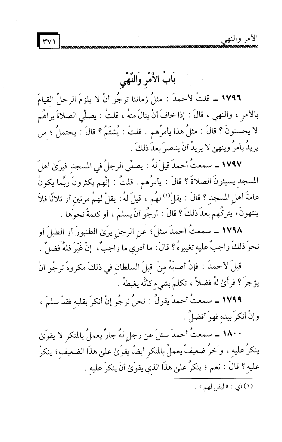 1796 - قُلْتُ لِأَحْمَدَ " مِثْلُ زَمَانِنَا تَرْجُو أَنْ لَا يَلْزَمَ الرَّجُلُ الْقِيَامَ بِالْأَمْرِ وَالنَّهْيِ، قَالَ: إِذَا خَافَ أَنْ يُنَالَ مِنْهُ، قُلْتُ: يُصَلِّي الصَّلَاةَ، يَرَاهُمْ لَا يُحْسِنُونَ؟ قَالَ: مِثْلُ هَذَا يَأْمُرُهُمْ.