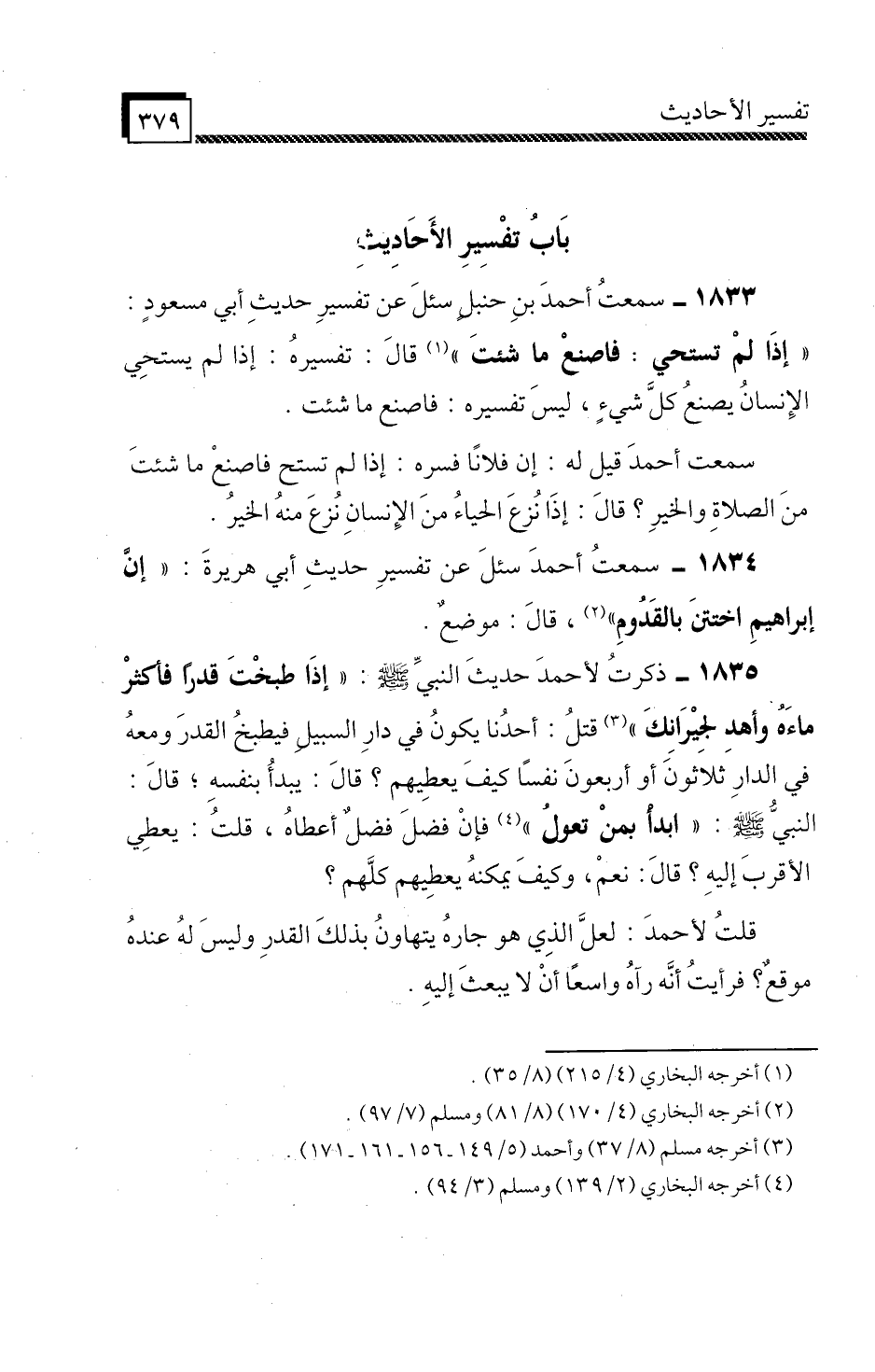 1833 - سَمِعْتُ أَحْمَدَ بْنَ حَنْبَلٍ، سُئِلَ عَنْ تَفْسِيرِ حَدِيثِ أَبِي مَسْعُودٍ: " إِذَا لمْ تَسْتَحِ: فَاصْنَعْ مَا شِئْتَ " قَالَ: تَفْسِيرُهُ: إِذَا لَمْ يَسْتَحِ الْإِنْسَانُ يَصْنَعُ كُلَّ شَيْءٍ، لَيْسَ تَفْسِيرُهُ: فَاصْنَعْ مَا شِئْتَ.