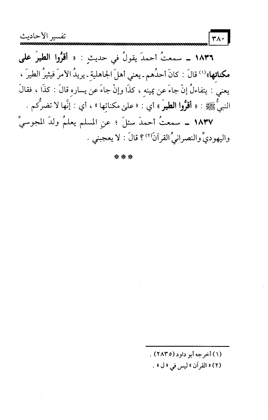 1836 - سَمِعْتُ أَحْمَدَ، يَقُولُ «فِي حَدِيثٍ أَقِرُّوا الطَّيْرَ عَلَى مَكِنَاتِهَا» , قَالَ: كَانَ أَحَدُهُمْ، يَعْنِي: أَهْلَ الْجَاهِلِيَّةِ يُرِيدُ الْأَمْرَ فَيُثِيرُ الطَّيْرَ، يَعْنِي: يَتَفَاءَلُ إِنْ جَاءَ عَنْ يَمِينِهِ، كَذَا وَإِنْ جَاءَ عَنْ يَسَارِهِ، قَالَ: كَذَا، فَقَالَ النَّبِيُّ صَلَّى اللَّهُ عَلَيْهِ وَسَلَّمَ: «أَقِرُّوا الطَّيْرَ» أَيْ: «عَلَى مَكِنَاتِهَا» ، أَيْ: إِنَّهَا لَا تَضُرُّكُمْ.