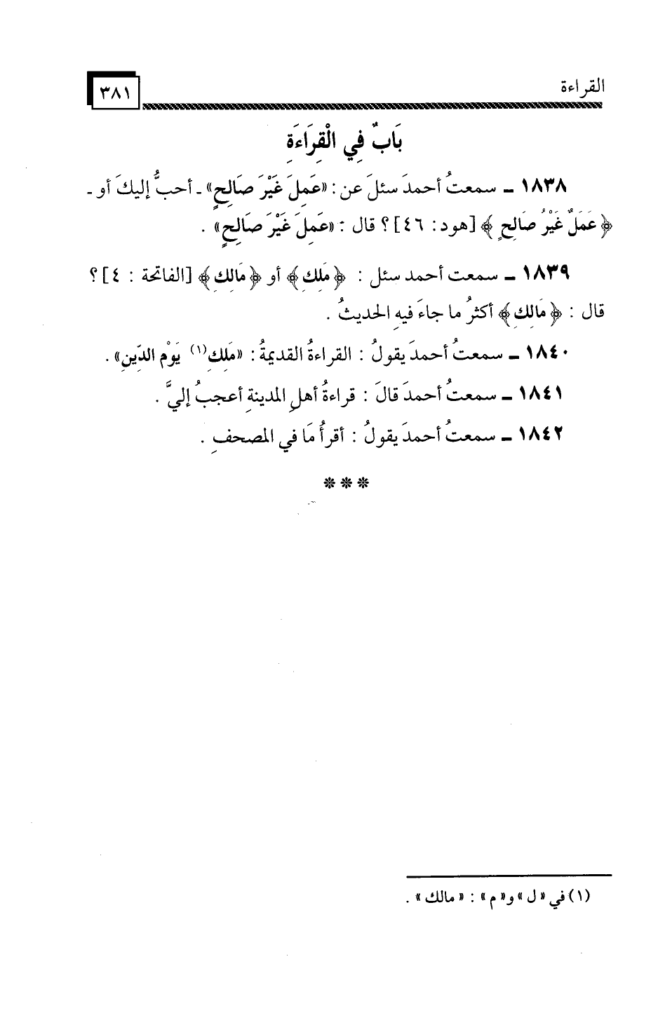 1840 - سَمِعْتُ أَحْمَدَ، يَقُولُ: " الْقِرَاءَةُ الْقَدِيمَةُ: مَلِكِ يَوْمِ الدِّينِ «.