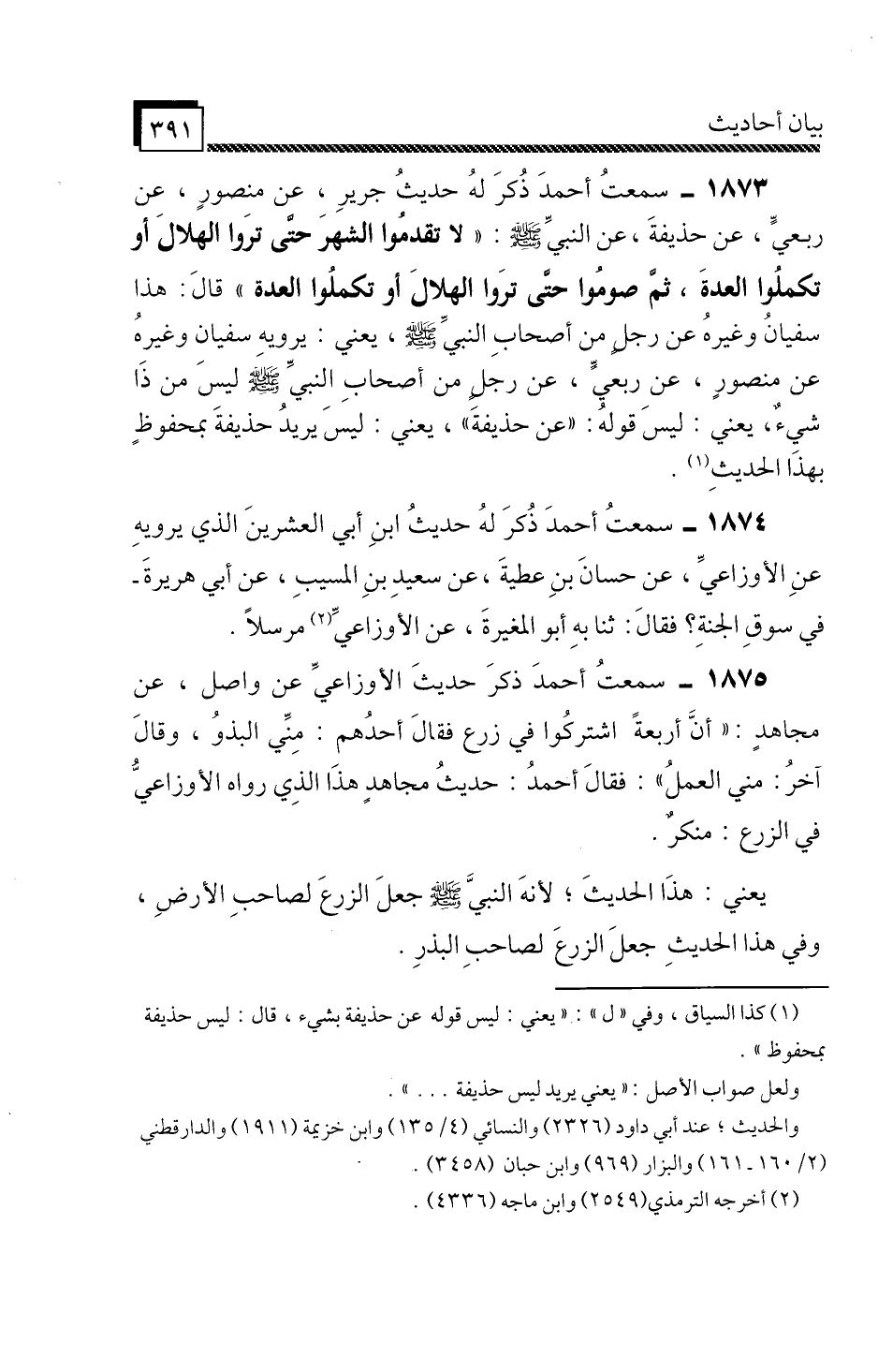 1873 - سَمِعْتُ أَحْمَدَ، ذُكِرَ لَهُ حَدِيثُ جَرِيرٍ، عَنْ مَنْصُورٍ، عَنْ رِبْعِيٍّ، عَنْ حُذَيْفَةَ، عَنِ النَّبِيِّ صَلَّى اللَّهُ عَلَيْهِ وَسَلَّمَ: «لَا تَقَدَّمُوا الشَّهْرَ حَتَّى تَرَوُا الْهِلَالَ أَوْ تُكْمِلُوا الْعِدَّةَ، ثُمَّ صُومُوا حَتَّى تَرَوُا الْهِلَالَ أَوْ تُكْمِلُوا الْعِدَّةَ» , قَالَ: هَذَا سُفْيَانُ وَغَيْرُهُ، عَنْ رَجُلٍ مِنْ أَصْحَابِ النَّبِيِّ صَلَّى اللَّهُ عَلَيْهِ وَسَلَّمَ، يَعْنِي: يَرْوِيهِ سُفْيَانُ وَغَيْرُهُ، عَنْ مَنْصُورٍ، عَنْ رِبْعِيٍّ، عَنْ رَجُلٍ مِنْ أَصْحَابِ النَّبِيِّ صَلَّى اللَّهُ عَلَيْهِ وَسَلَّمَ، لَيْسَ مِنْ ذَا شَيْءٌ، يَعْنِي: لَيْسَ قَوْلُهُ: عَنْ حُذَيْفَةَ، يَعْنِي: لَيْسَ يُرِيدُ حُذَيْفَةَ بِمَحْفُوظٍ بِهَذَا الْحَدِيثِ