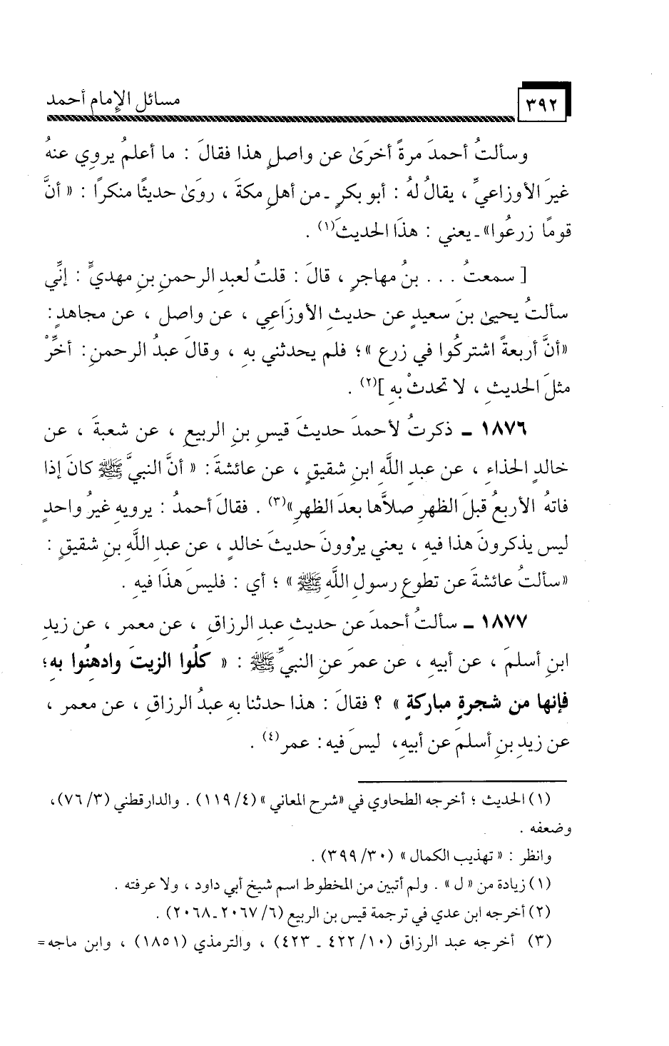 1877 - سَأَلْتُ أَحْمَدَ عَنْ حَدِيثِ عَبْدِ الرَّزَّاقِ عَنْ مَعْمَرٍ، عَنْ زَيْدِ بْنِ أَسْلَمَ، عَنْ أَبِيهِ، عَنْ عُمَرَ، عَنِ النَّبِيِّ صَلَّى اللَّهُ عَلَيْهِ وَسَلَّمَ: «كُلُوا الزَّيْتَ وَادَّهِنُوا بِهِ، فَإِنَّهُ مِنْ شَجَرَةٍ مُبَارَكَةٍ» , فَقَالَ: هَذَا حَدَّثَنَا بِهِ عَبْدُ الرَّزَّاقِ، عَنْ مَعْمَرٍ، عَنْ زَيْدِ بْنِ أَسْلَمَ، عَنْ أَبِيهِ، لَيْسَ فِيهِ عُمَرُ