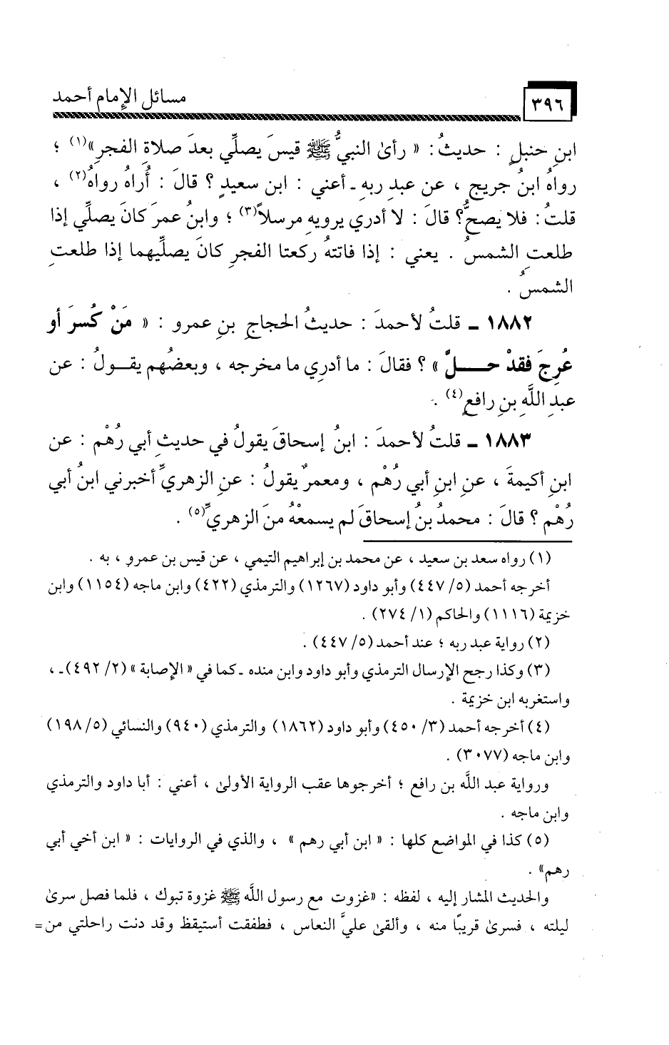 1882 - قُلْتُ لِأَحْمَدَ: حَدِيثُ الْحَجَّاجِ بْنِ عَمْرٍو «مَنْ كُسِرَ أَوْ عُرِجَ فَقَدْ حَلَّ» ، فَقَالَ: مَا أَدْرِي مَا مَخْرَجُهُ، وَبَعْضُهُمْ يَقُولُ: عَنْ عَبْدِ اللَّهِ بْنِ رَافِعٍ.