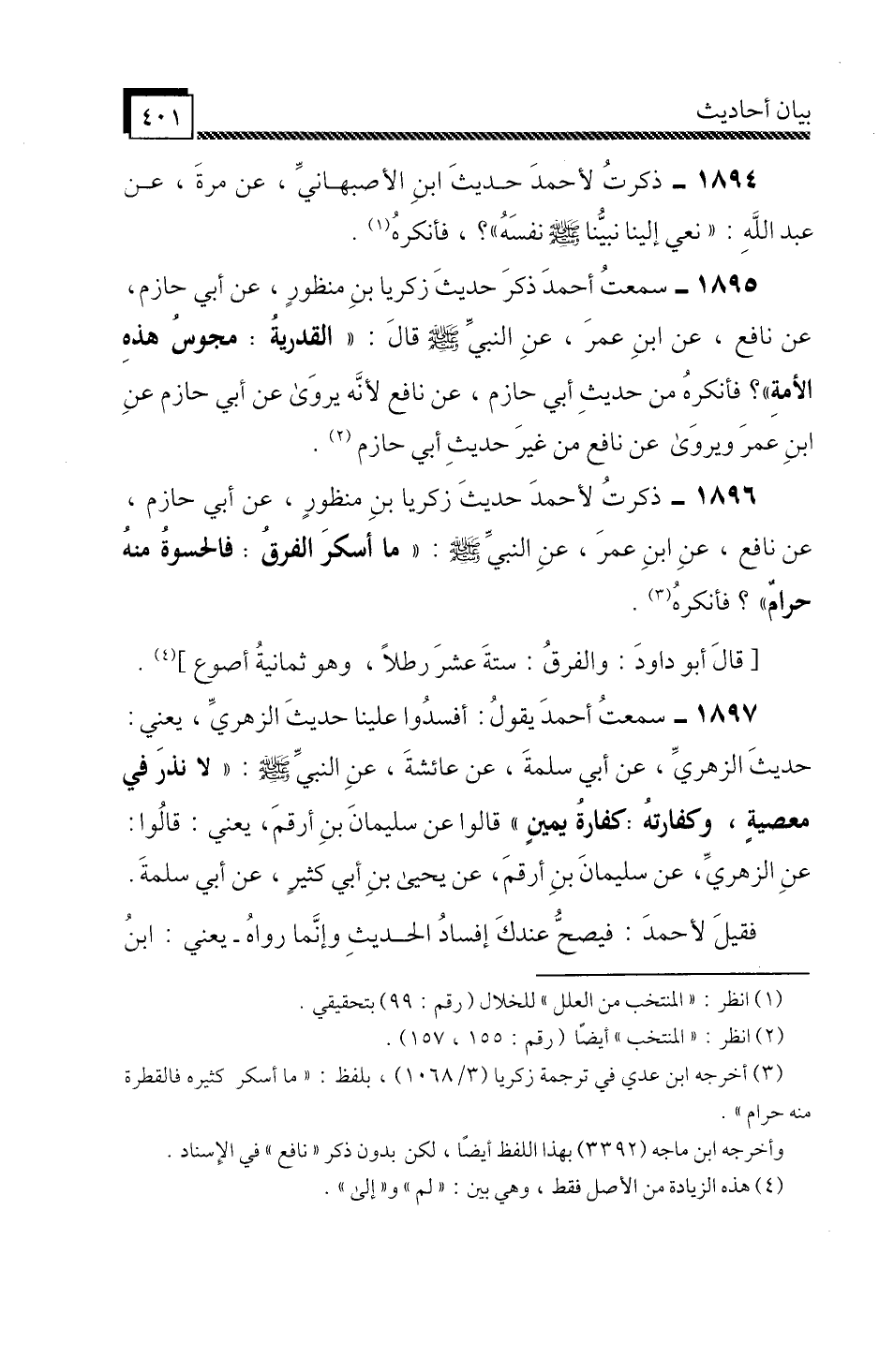 1895 - سَمِعْتُ أَحْمَدَ، ذَكَرَ حَدِيثَ زَكَرِيَّا بْنِ مَنْظُورٍ، عَنْ أَبِي حَازِمٍ، عَنْ نَافِعٍ، عَنِ ابْنِ عُمَرَ، عَنِ النَّبِيِّ صَلَّى اللَّهُ عَلَيْهِ وَسَلَّمَ قَالَ: «الْقَدَرِيَّةُ مَجُوسُ هَذِهِ الْأُمَّةِ» , فَأَنْكَرَهُ مِنْ حَدِيثِ أَبِي حَازِمٍ، عَنْ نَافِعٍ لِأَنَّهُ يُرْوَى عَنْ أَبِي حَازِمٍ، عَنِ ابْنِ عُمَرَ، وَيُرْوَى عَنْ نَافِعٍ مِنْ غَيْرِ حَدِيثِ أَبِي حَازِمٍ