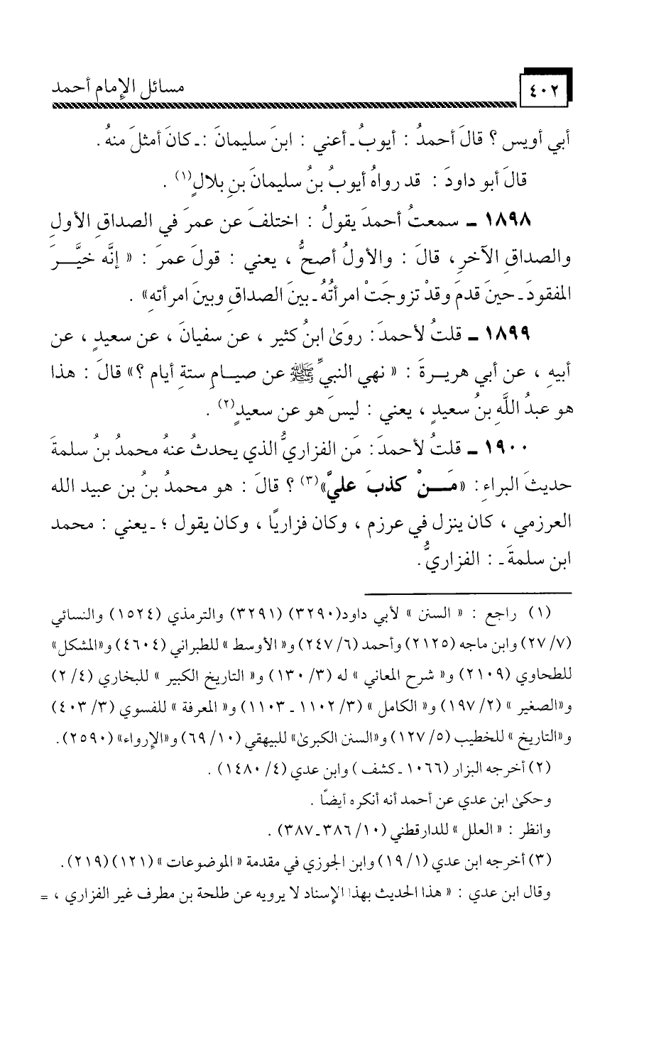 1900 - قُلْتُ لِأَحْمَدَ: مَنِ الْفَزَارِيُّ الَّذِي يُحَدِّثُ عَنْهُ مُحَمَّدُ بْنُ سَلَمَةَ حَدِيثَ الْبَرَاءِ «مَنْ كَذَبَ عَلَيَّ» ؟ قَالَ: هُوَ مُحَمَّدُ بْنُ عُبَيْدِ اللَّهِ الْعَزْرَمِيُّ، كَانَ يَنْزِلُ فِي عَرْزَمَ، وَكَانَ فَزَارِيًّا، وَكَانَ يَقُولُ، يَعْنِي: مُحَمَّدَ بْنَ سَلَمَةَ: الْفَزَارِيَّ.