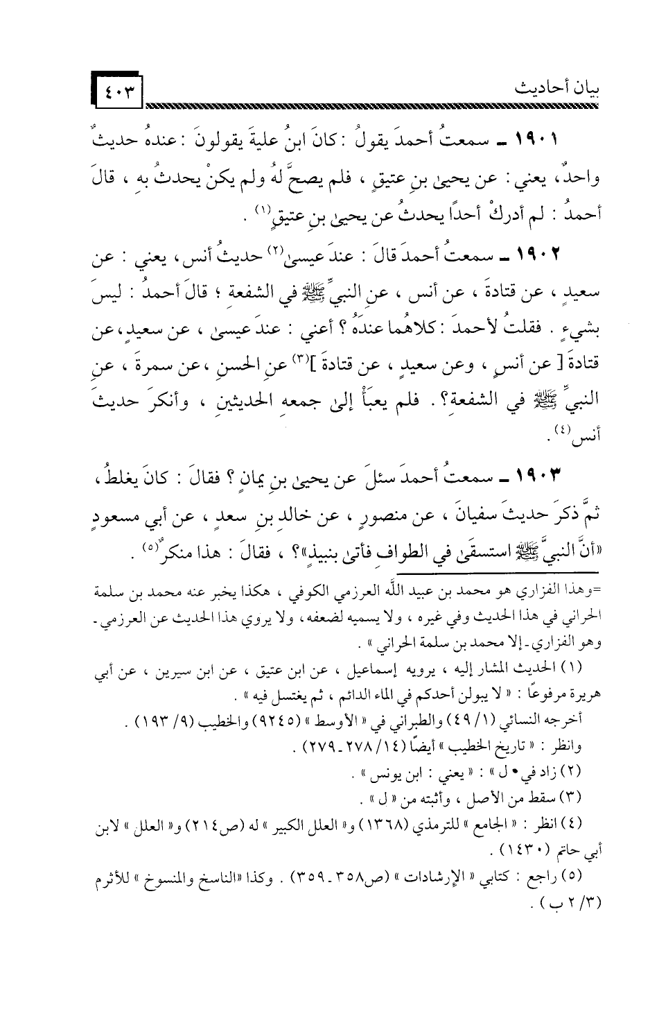 1902 - سَمِعْتُ أَحْمَدَ، قَالَ: عِنْدَ عِيسَى حَدِيثُ أَنَسٍ، يَعْنِي عَنْ سَعِيدٍ، عَنْ قَتَادَةَ، عَنْ أَنَسٍ، عَنِ النَّبِيِّ صَلَّى اللَّهُ عَلَيْهِ وَسَلَّمَ فِي الشُّفْعَةِ، قَالَ أَحْمَدُ: لَيْسَ بِشَيْءٍ، فَقُلْتُ لِأَحْمَدَ: كِلَاهُمَا عِنْدَهُ؟ أَعْنِي: عِنْدَ عِيسَى، عَنْ سَعِيدٍ، عَنْ قَتَادَةَ، عَنْ أَنَسٍ، وَعَنْ سَعِيدٍ، عَنْ قَتَادَةَ، عَنِ الْحَسَنِ، عَنْ سَمُرَةَ، عَنِ النَّبِيِّ صَلَّى اللَّهُ عَلَيْهِ وَسَلَّمَ فِي الشُّفْعَةِ، فَلَمْ يَعْبَأْ إِلَى جَمْعِهِ الْحَدِيثَيْنِ، وَأَنْكَرَ حَدِيثَ أَنَسٍ.
