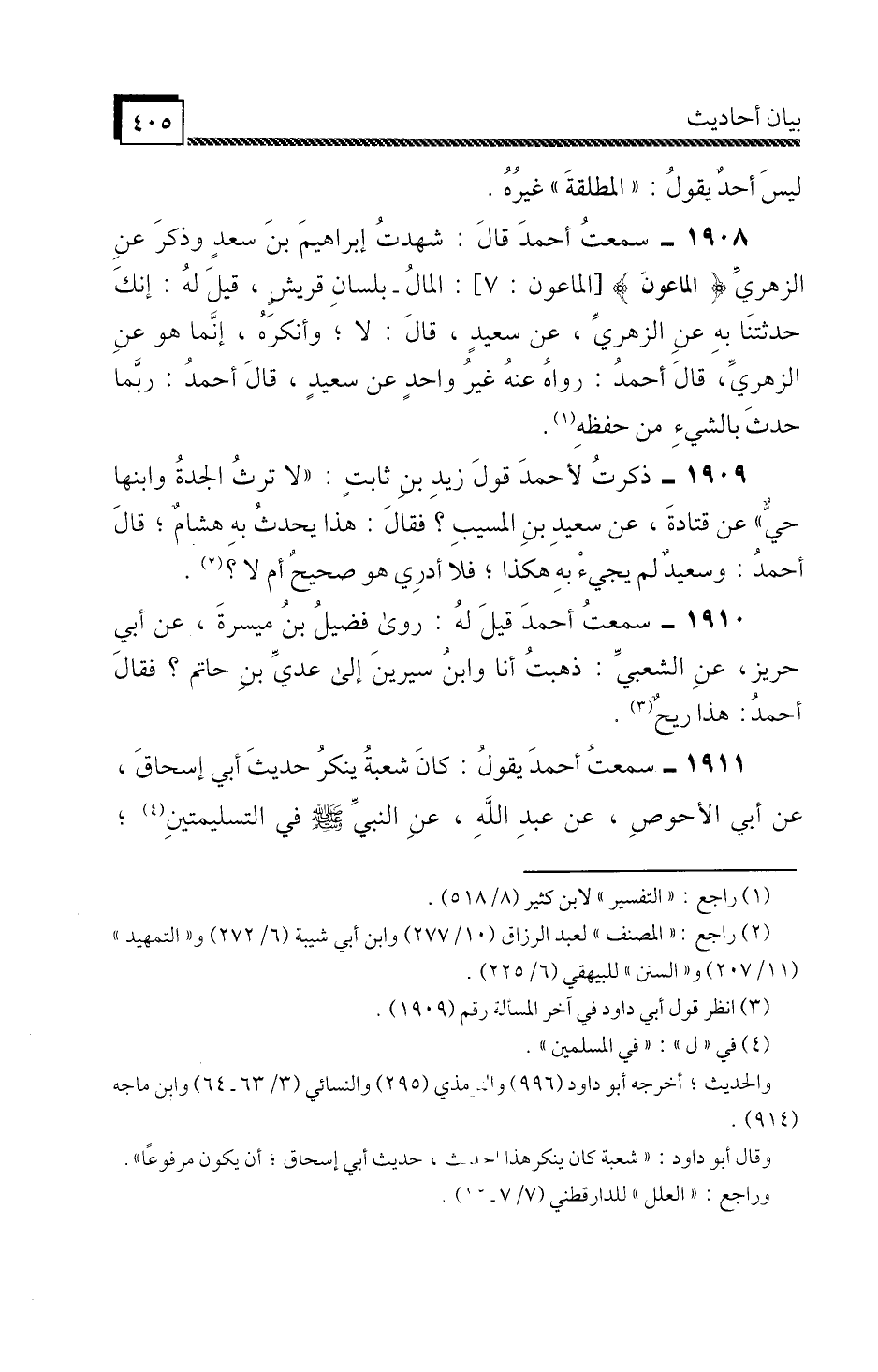 1911 - سَمِعْتُ أَحْمَدَ، يَقُولُ: كَانَ شُعْبَةُ يُنْكِرُ حَدِيثَ أَبِي إِسْحَاقَ، عَنْ أَبِي الْأَحْوَصِ، عَنْ عَبْدِ اللَّهِ، عَنِ النَّبِيِّ صَلَّى اللَّهُ عَلَيْهِ وَسَلَّمَ فِي التَّسْلِيمَتَيْنِ،