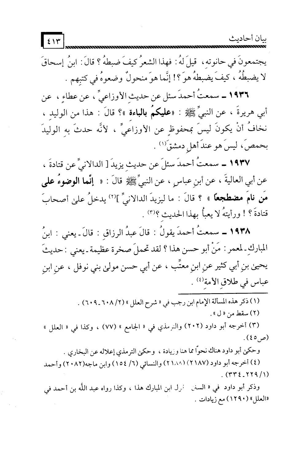 1937 - سَمِعْتُ أَحْمَدَ، سُئِلَ عَنْ حَدِيثِ يَزِيدَ الدَّالَانِيِّ: عَنْ قَتَادَةَ، عَنْ أَبِي الْعَالِيَةِ، عَنِ ابْنِ عَبَّاسٍ، عَنِ النَّبِيِّ صَلَّى اللَّهُ عَلَيْهِ وَسَلَّمَ، قَالَ: «إِنَّمَا الْوُضُوءُ عَلَى مَنْ نَامَ مُضْطَجِعًا» , قَالَ: مَا لِيَزِيدَ الدَّالَانِيِّ يَدْخُلُ عَلَى أَصْحَابِ قَتَادَةَ؟ ! وَرَأَيْتُهُ لَا يَعْبَأُ بِهَذَا الْحَدِيثِ