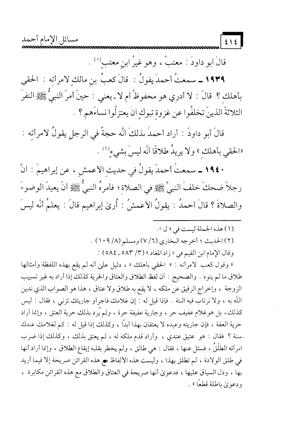 1939 - سَمِعْتُ أَحْمَدَ، يَقُولُ: قَالَ كَعْبُ بْنُ مَالِكٍ لِامْرَأَتِهِ: الْحَقِي بِأَهْلِكِ، قَالَ: لَا أَدْرِي هُوَ مَحْفُوظٌ أَمْ لَا، يَعْنِي «حِينَ أَمَرَ النَّبِيُّ صَلَّى اللَّهُ عَلَيْهِ وَسَلَّمَ النَّفَرَ الثَّلَاثَةَ الَّذِينَ تَخَلَّفُوا عَنْ غَزْوَةِ تَبُوكَ أَنْ يَعْتَزِلُوا نِسَاءَهُمْ» .