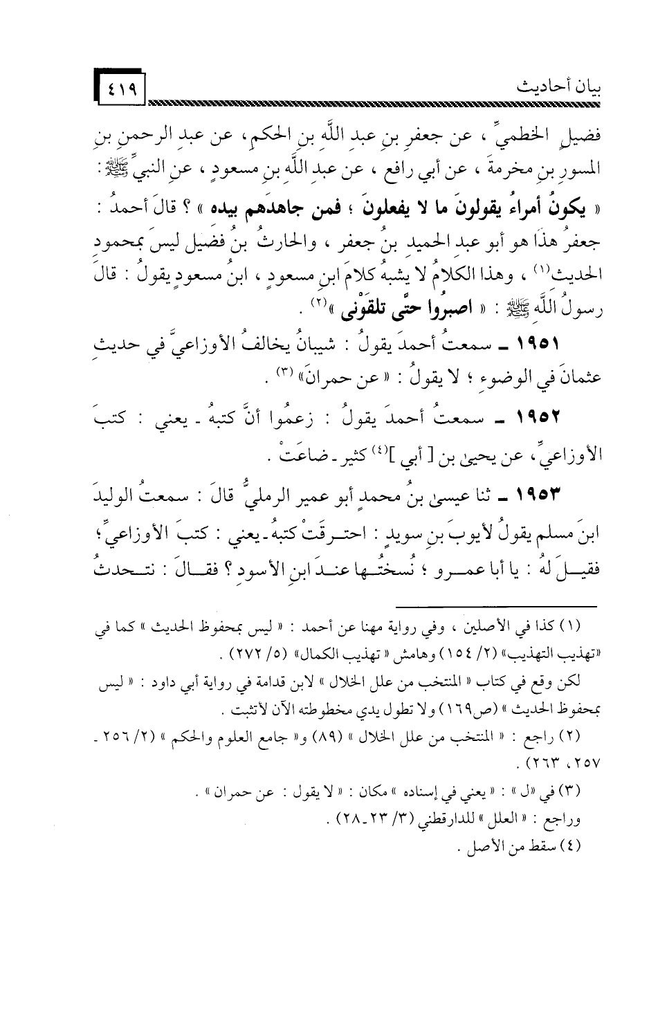 1951 - سَمِعْتُ أَحْمَدَ، يَقُولُ: شَيْبَانُ يُخَالِفُ الْأَوْزَاعِيَّ فِي حَدِيثِ عُثْمَانَ فِي الْوُضُوءِ، لَا يَقُولُ: عَنْ حَمْرَانَ.