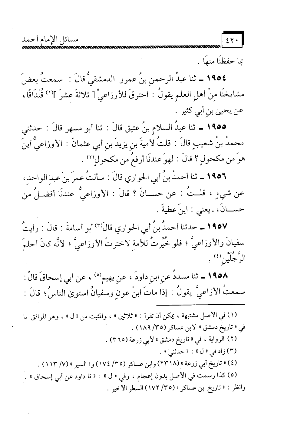 1958 - ثَنَا مُسَدَّدٌ، عَنِ ابْنِ دَاوُدَ، عَنْ يَهِيمَ، عَنْ أَبِي إِسْحَاقَ، قَالَ: سَمِعْتُ الْأَوْزَاعِيَّ، يَقُولُ: " إِذَا مَاتَ ابْنُ عَوْنٍ وَسُفْيَانُ اسْتَوَى النَّاسُ، قَالَ: