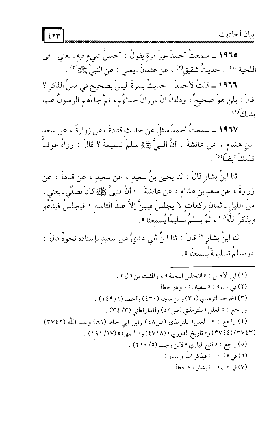 1967 - سَمِعْتُ أَحْمَدَ، سُئِلَ عَنْ حَدِيثِ قَتَادَةَ، عَنْ زُرَارَةَ، عَنْ سَعْدِ بْنِ هِشَامٍ، عَنْ عَائِشَةَ «أَنَّ النَّبِيَّ صَلَّى اللَّهُ عَلَيْهِ وَسَلَّمَ سَلَّمَ تَسْلِيمَةً» , قَالَ: رَوَاهُ عَوْفٌ كَذَلِكَ أَيْضًا