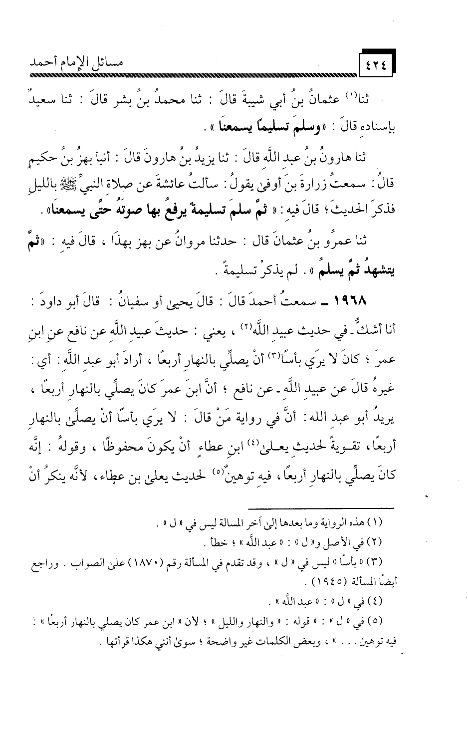 1968 - سَمِعْتُ أَحْمَدَ، قَالَ: قَالَ يَحْيَى، أَوْ سُفْيَانُ: قَالَ أَبُو دَاوُدَ: أَنَا أَشُكُّ فِي حَدِيثِ عُبَيْدِ اللَّهِ، يَعْنِي: حَدِيثَ عُبَيْدِ اللَّهِ، عَنْ نَافِعٍ، عَنِ ابْنِ عُمَرَ، كَانَ لَا يَرَى بَأْسًا أَنْ يُصَلِّيَ بِالنَّهَارِ أَرْبَعًا، أَرَادَ أَبُو عَبْدِ اللَّهِ: أَيْ: غَيْرُهُ، قَالَ: عَنْ عُبَيْدِ اللَّهِ، عَنْ نَافِعٍ، أَنَّ ابْنَ عُمَرَ كَانَ يُصَلِّي بِالنَّهَارِ أَرْبَعًا، يُرِيدُ أَبُو عَبْدِ اللَّهِ: أَنَّ فِي رِوَايَةِ مَنْ قَالَ: لَا يَرَى بَأْسًا أَنْ يُصَلِّيَ بِالنَّهَارِ أَرْبَعًا، تَقْوِيَةً لِحَدِيثِ يَعْلَى بْنِ عَطَاءٍ أَنْ يَكُونَ مَحْفُوظًا، وَقَوْلُهُ: إِنَّهُ كَانَ يُصَلِّي بِالنَّهَارِ أَرْبَعًا فِيهِ تَوْهِينٌ لِحَدِيثِ يَعْلَى بْنِ عَطَاءٍ، لِأَنَّهُ يُنْكِرُ أَنْ