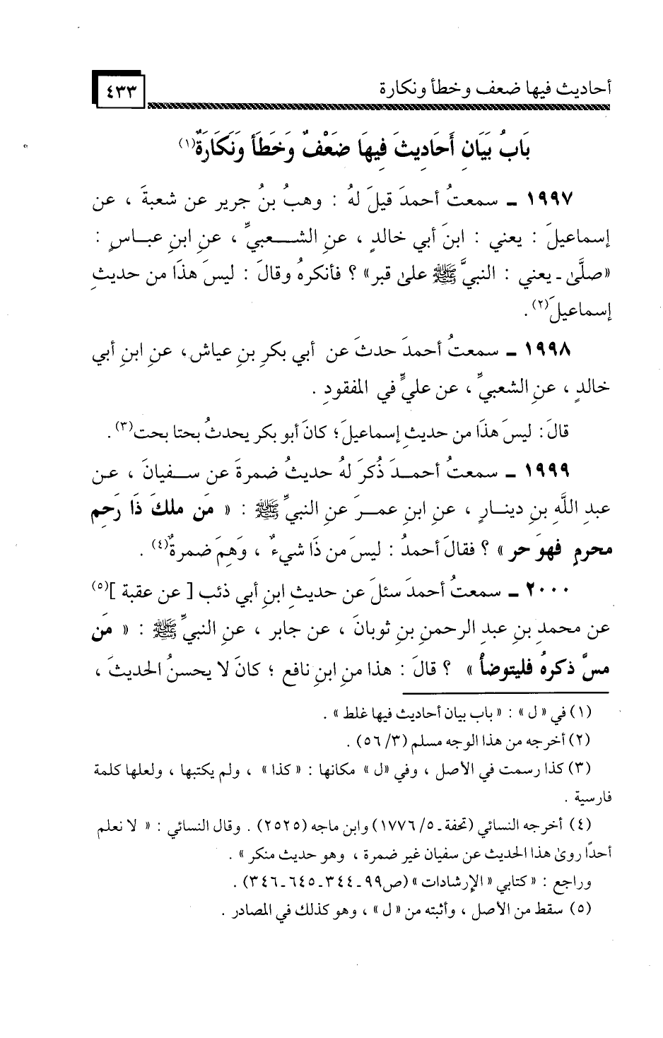 1999 - سَمِعْتُ أَحْمَدَ، ذُكِرَ لَهُ حَدِيثُ ضَمْرَةَ، عَنْ سُفْيَانَ، عَنْ عَبْدِ اللَّهِ بْنِ دِينَارٍ، عَنِ ابْنِ عُمَرَ، عَنِ النَّبِيِّ صَلَّى اللَّهُ عَلَيْهِ وَسَلَّمَ: «مَنْ مَلَكَ ذَا رَحِمٍ مَحْرَمٍ فَهُوَ حُرٌّ» فَقَالَ أَحْمَدُ: لَيْسَ مِنْ ذَا شَيْءٌ، وَهِمَ ضَمْرَةٌ